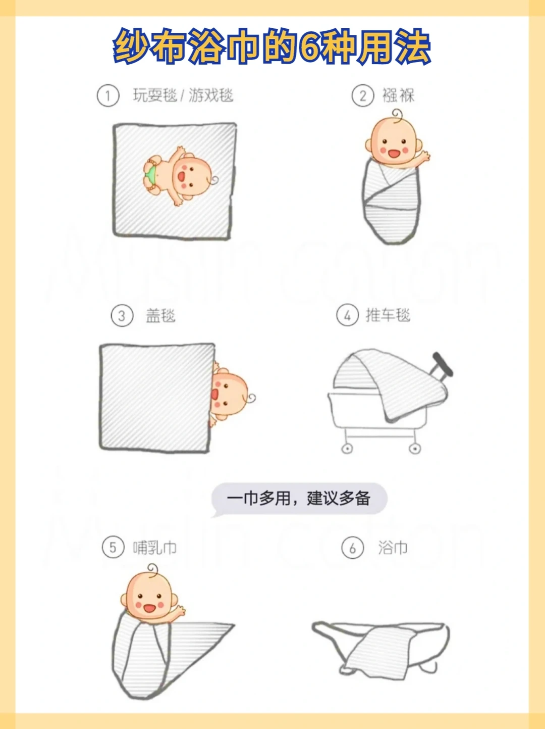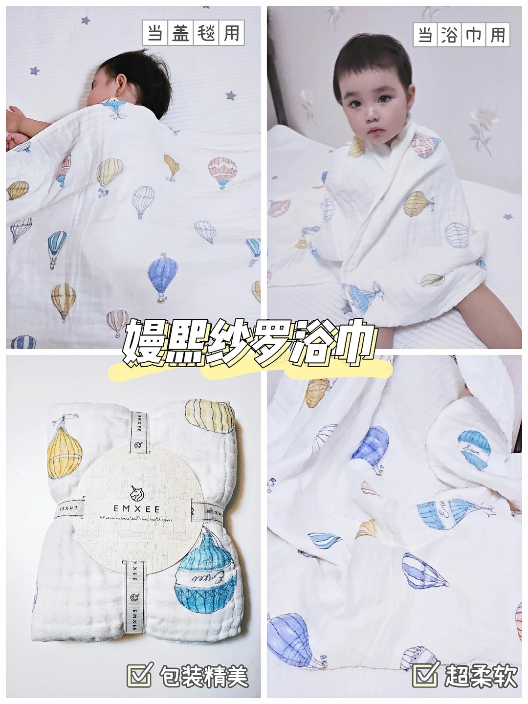 🔵我家宝宝是夏天出生的,一直用的嫚熙纱布浴巾,因为手感柔软,面料舒服透气,囤上两三条,可以洗澡当浴巾用,还可以当盖毯、床单、包襁褓、游戏毯、出门推车里带上也方便实用。