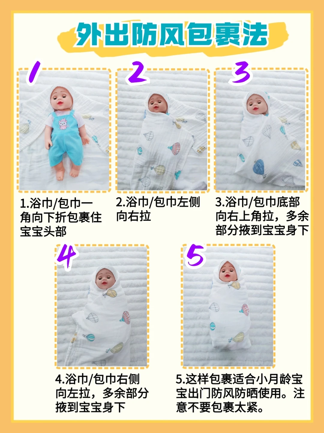 👉这样包裹适合小月龄宝宝出门防风防晒使用。注意不要包裹太紧哦。