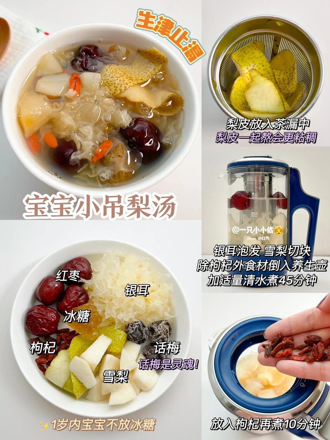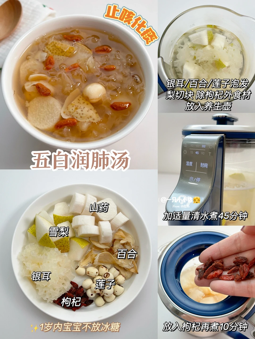 🔸步骤:银耳+百合+莲子泡发,雪梨切块,除枸杞外食材放入养生壶,加适量清水煮45分钟;放入枸杞再煮10分钟✅