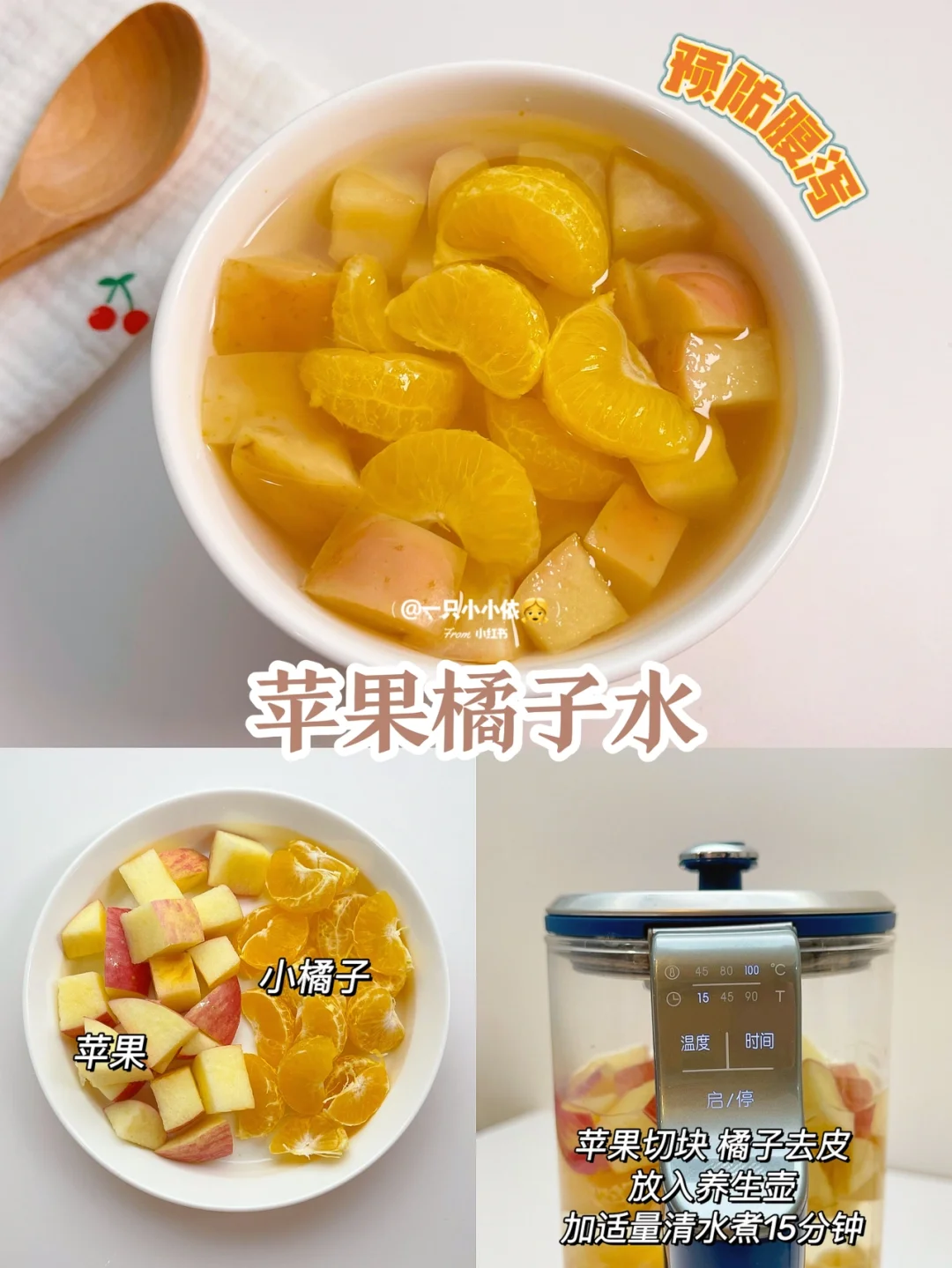 🔸步骤:苹果切块,橘子去皮掰小块,放入养生壶,加适量清水煮15分钟✅