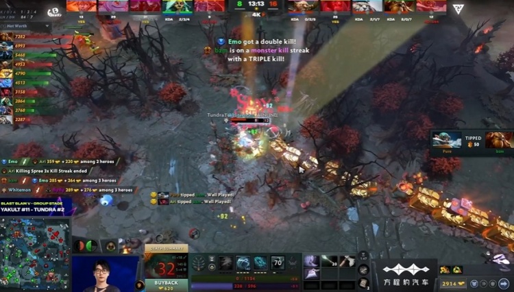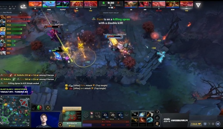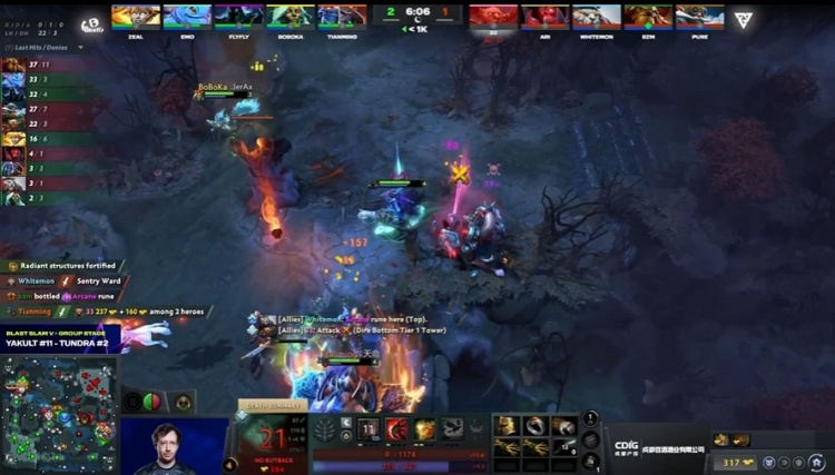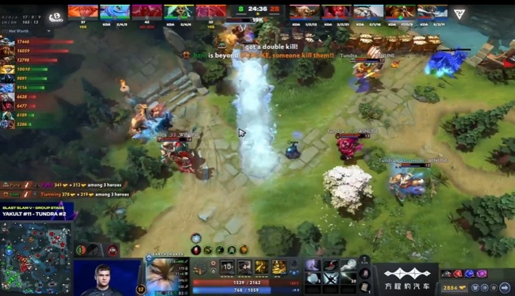 [24分钟]Tundra中路推进,YB尝试动手秒pure飞机,Ari暗影恶魔关一手救下了残血飞机,飞机拉扯出来反打,不光完成双杀,更击杀了flyfly亚巴顿,Tundra中路上高磨掉了中路高地塔。