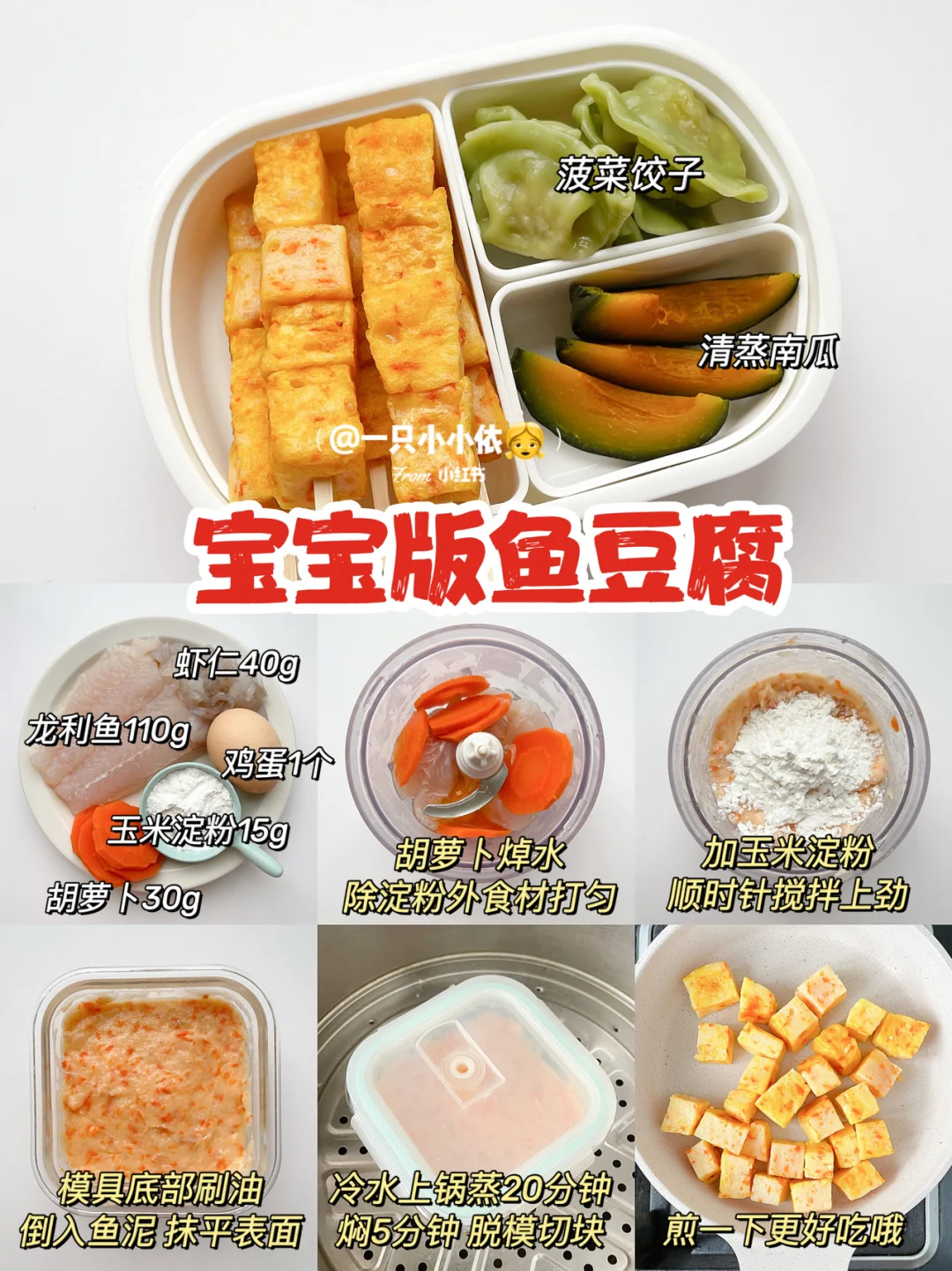 🔸食材:龙利鱼110g、虾仁40g、鸡蛋1个、玉米淀粉15g、胡萝卜30g