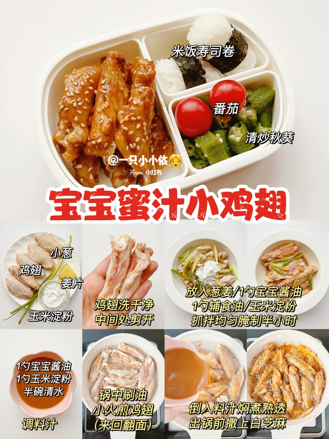 🔹步骤:鸡翅洗干净,中间处剪开;放入葱姜/1勺子宝宝酱油/1勺辅食油/玉米淀粉,抓拌均匀腌制半小时;调料汁(1勺宝宝酱油+1勺玉米淀粉+半碗清水);锅中刷油,小火煎鸡翅,来回翻面都煎到;倒入料汁焖煮熟透,出锅前撒上白芝麻