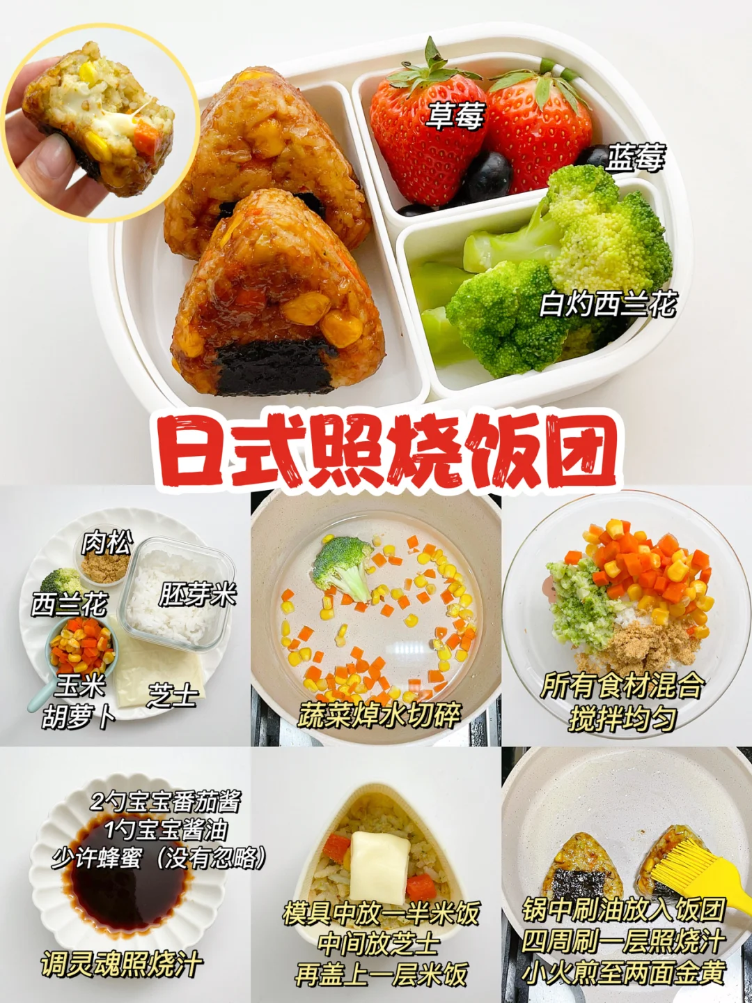 🔸食材:肉松、西兰花、玉米、胡萝卜、芝士、胚芽米