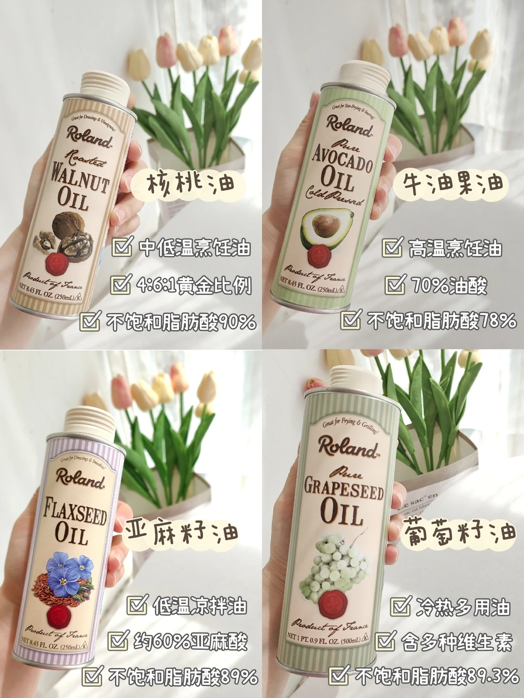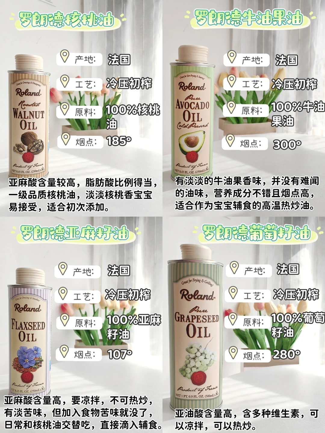 不同油有不同油的特点,像罗朗德亚麻籽油的亚麻酸含量57%。