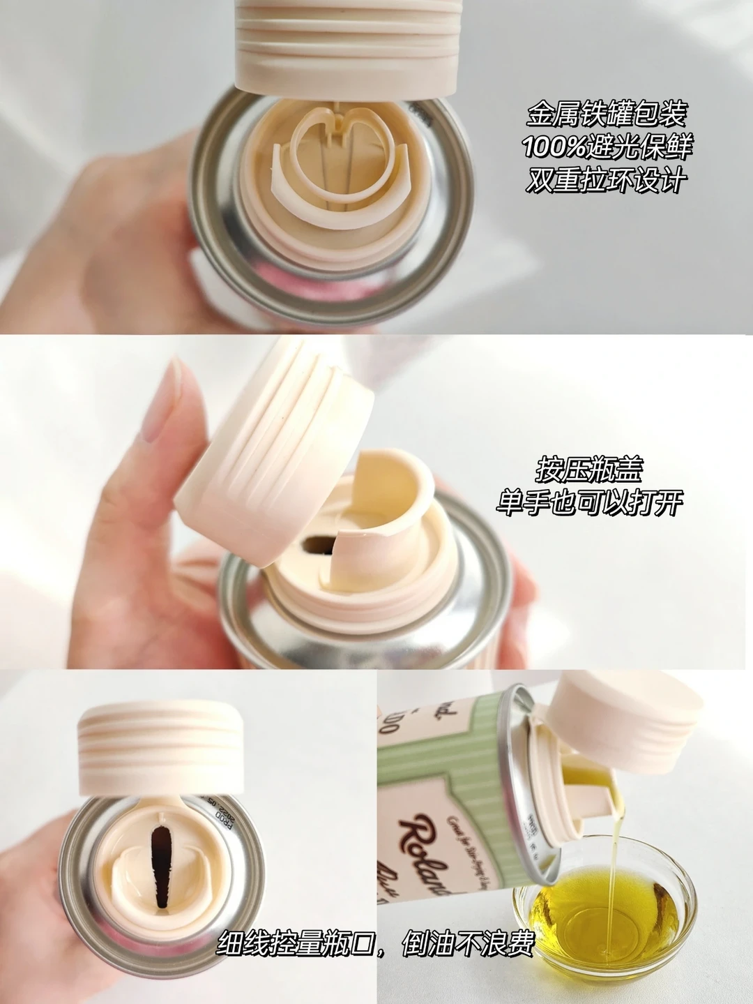 我家里常备4瓶油,凉拌油(罗朗德核桃油、亚麻籽油),热炒油(罗朗德牛油果油、葡萄籽油)。他们家的辅食油品类齐全,经常给宝宝换着吃,补充多样的脂肪酸和微量元素。所有辅食油瓶口缝隙形设计,流速缓慢,用量好掌控,单手开盖,深得我心~