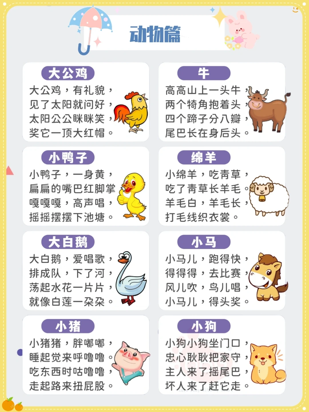 ✨有利于记忆力提高。小孩子天然喜欢小动物和自己熟悉的事物,押韵对仗的顺口溜,宝宝听起来悦耳,读起来顺口,记起来容易。