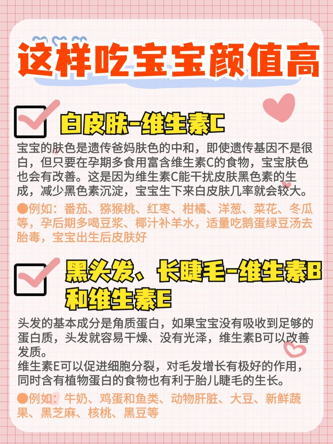 维生素C的食物,宝宝肤色也会有改善。这是因为维生素C能干扰皮肤黑色素的生成,减少黑色素沉淀,宝宝生下来白皮肤几率就会较大。