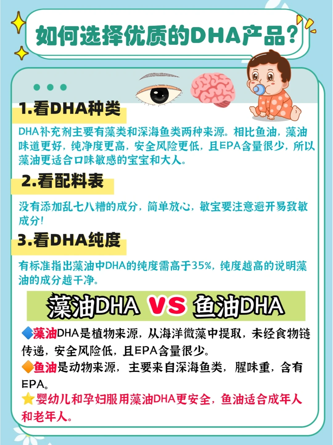 ✨看DHA种类。DHA补充剂主要有藻类和深海鱼类两种来源。相比鱼油,藻油味道更好,纯净度更高,安全风险更低,且EPA含量很少,所以藻油更适合口味敏感的宝宝和大人。