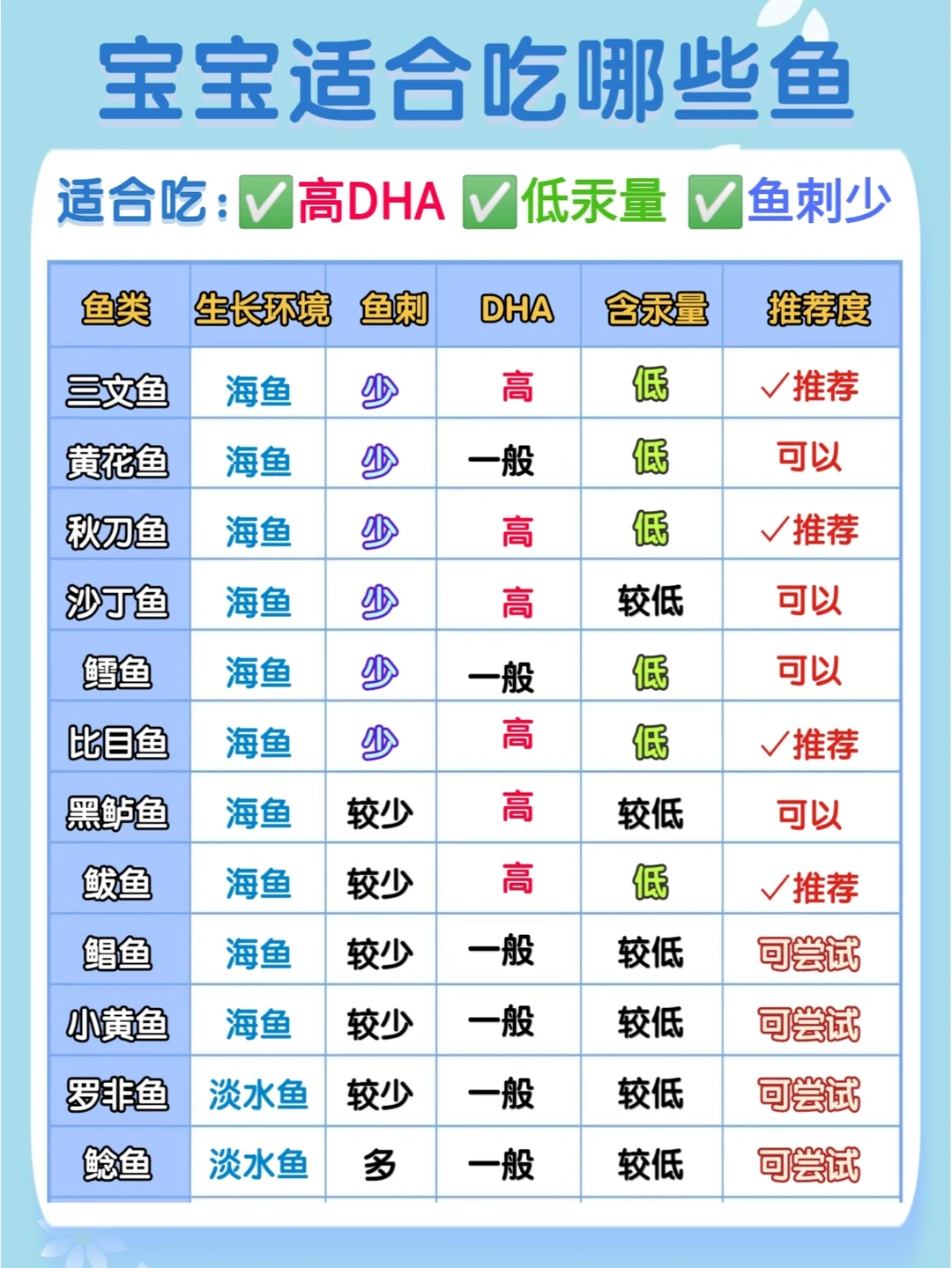 三文鱼、鳕鱼、龙利鱼等低汞、刺少的鱼适合宝宝吃