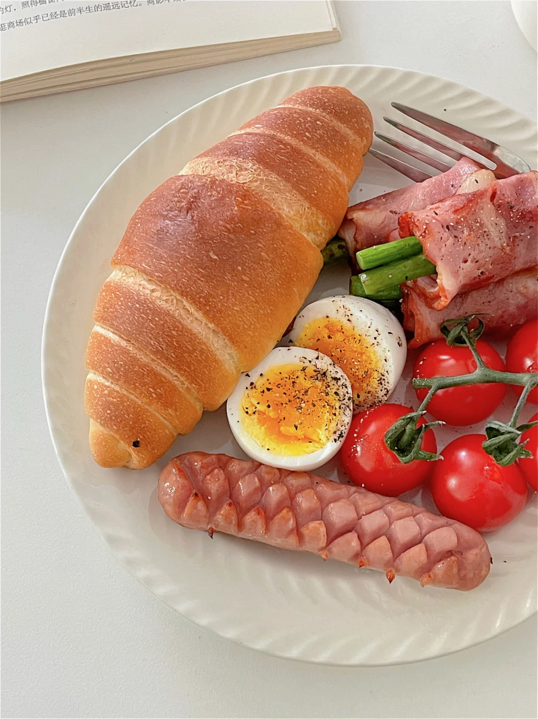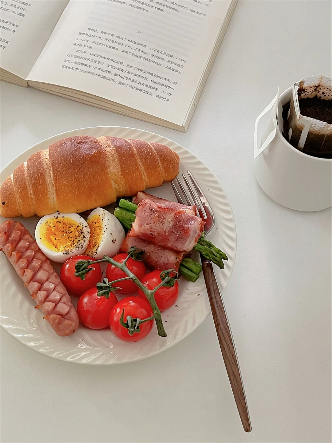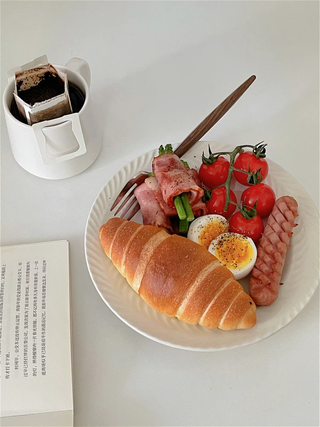 5.19早餐|今天好多肉肉[哇R] -培根芦笋 肉肠 水煮蛋 小番茄 挂耳 可颂 忽晴忽阴的天气☁️ 好乏闷噢~ 这一盘吃下去好饱(嗝) 希望大家度过愉快的一天 早安[派对R]