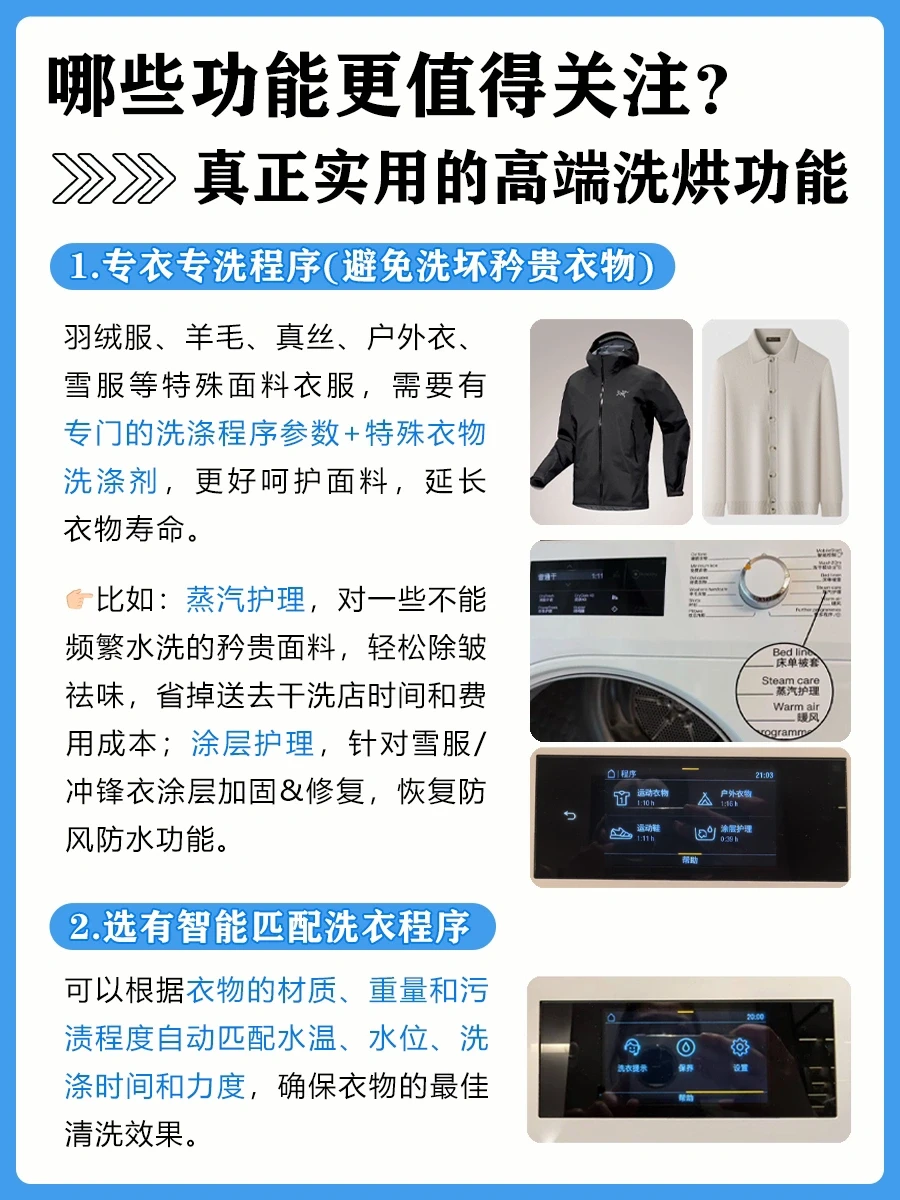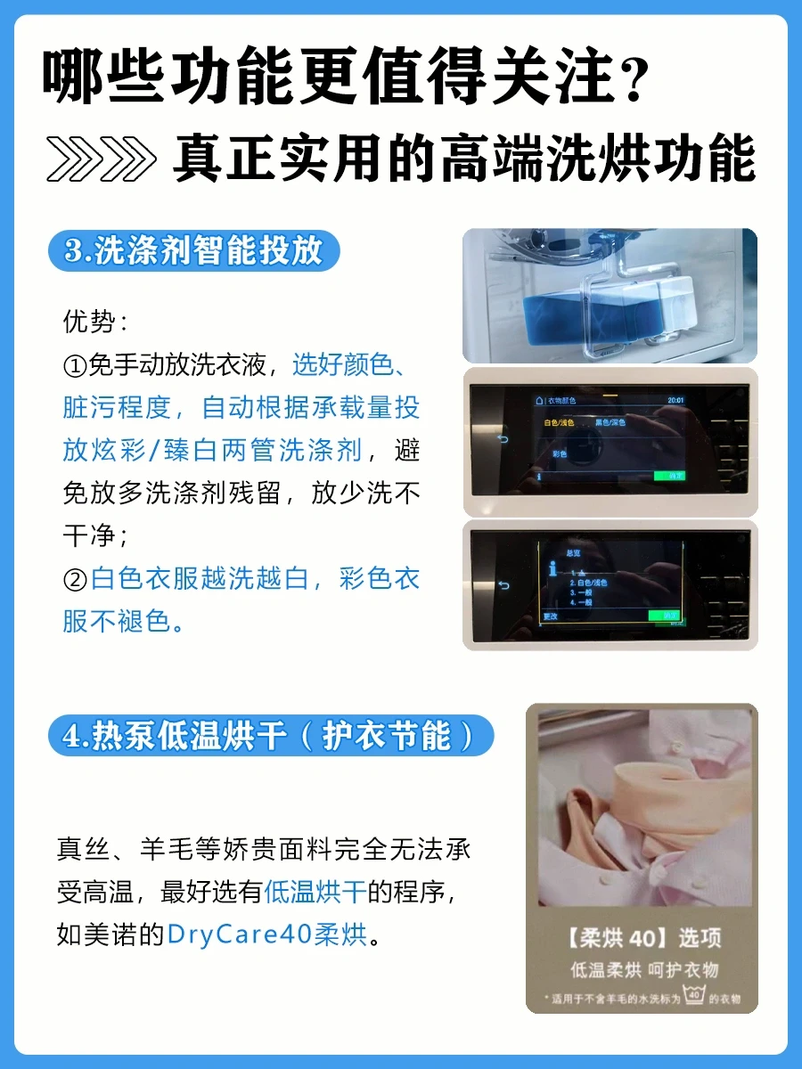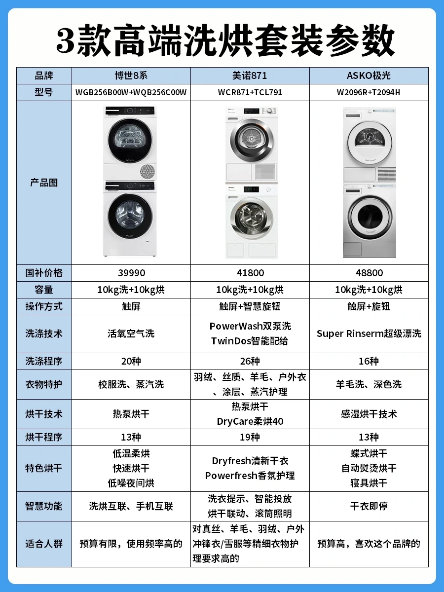 换季时,羽绒服、羊毛、真丝等衣物的洗涤护理非常让人头疼😩,一款高端洗烘套装就能很好的解决这些问题,在美诺、博世、asko三个高端品牌中纠结的看过来!为避免踩坑当冤大头,🔍问了DeepSeek,这三个品牌这些品牌中一些华而不实的程序和参数,方便对比产品溢价情况,具体如下: 1️⃣“空气洗/活氧洗” 🔸看似高级,宣称可无水去味、除菌。 🔸实际体验:对轻微异味(如火锅味)有效。 2️⃣“超高温杀菌(90℃+)” 🔸看似高级:宣称可深度杀菌。 🔸实际体验:日常衣物60℃已足够杀菌,90℃易导致缩水褪色。 真丝、羊毛等娇贵面料完全无法承受高温,功能适用性极低。 3️⃣“全金属机身” 🔸看似高级,宣传无橡胶门封,采用不锈钢设计,避免细菌滋生。 🔸实际体验:金属门封确实更卫生,但普通橡胶门封定期清洁即可。 📝哪些功能更值得关注?? 真正实用的高端洗烘功能包括:专衣专洗程序(避免洗坏矜贵衣物)、热泵低温烘干(护衣节能)、多层毛屑过滤(减少二次污染)、智能判干技术(避免过度烘干)、大筒径+容量(提升洗涤效率)
