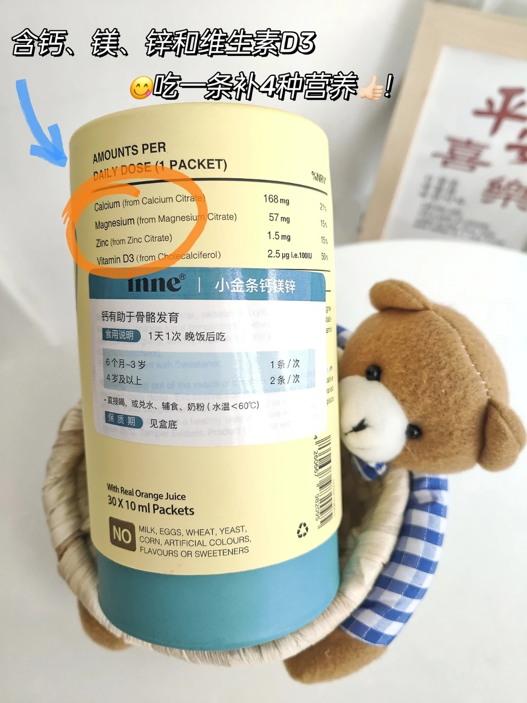 里面同时含有镁,锌和维生素D3。能够多方面给孩子提供营养补给!