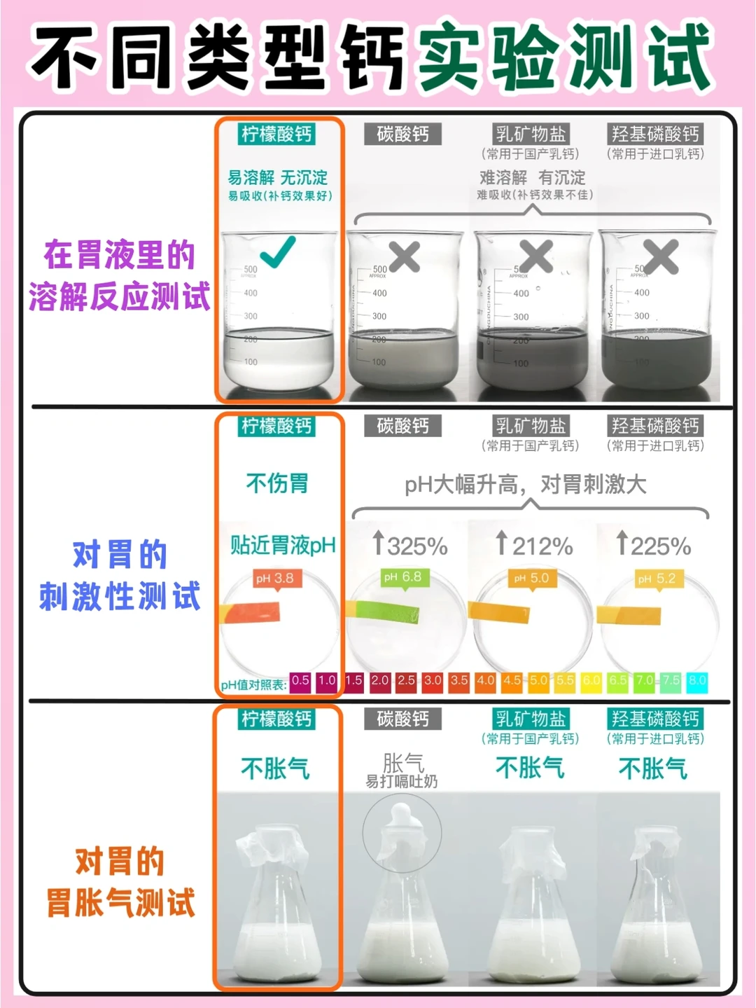 有专门的实验数据表明,柠檬酸钙更易吸收、对胃肠道无刺激,且不会产生胃胀气!