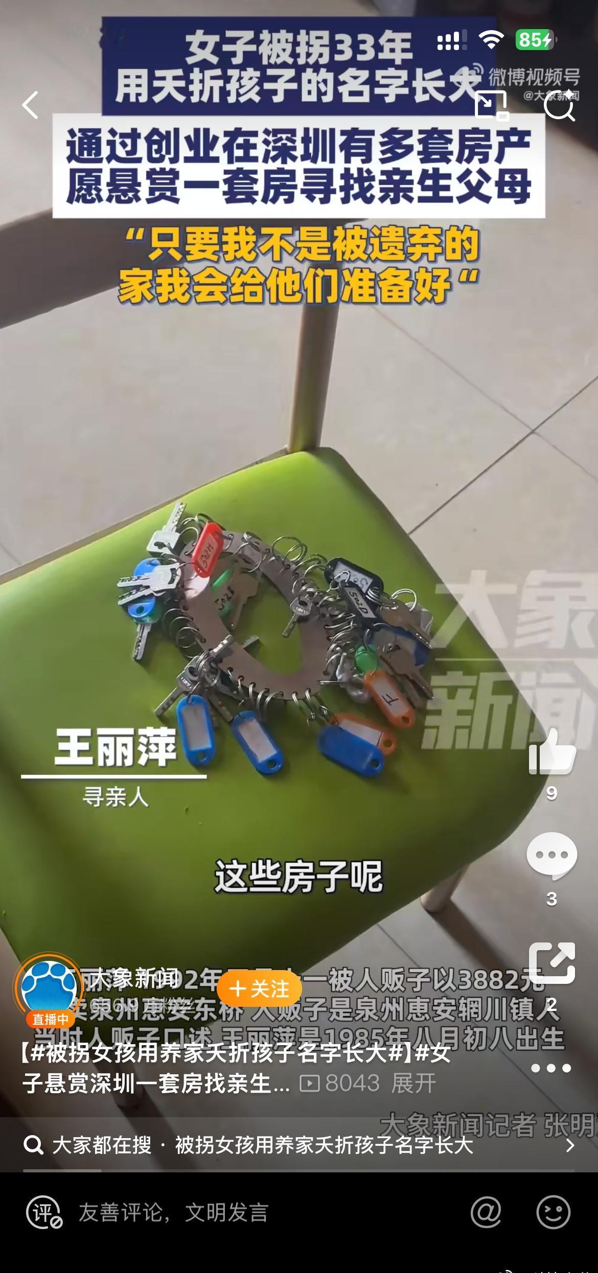 王丽萍1992年正月十一被人贩子以3882元拐卖至泉州惠安东桥。她表示,自己现在的名字是养家之前夭折孩子的名字,那个孩子四岁左右夭折,养家就买了六岁的她,并用夭折孩子的身份信息入户。 王丽萍称,人贩子是泉州惠安辋川镇人,当时口述她是1985年八月初八出生,原生家庭的房子下面是石头做的,上面是木头做的,家中有姐姐,还有一个不知是弟弟还是哥哥,父亲砍柴受伤,爷爷奶奶住对面。被拐卖时,王丽萍剪的短发,脚穿带红白条纹的鞋,灰黑色布裤,棉花格的波洞上衣,大腿两侧各有一个痣。 王丽萍长大后通过创业,在深圳拥有几套房产,过上了小康生活。她希望家人能勇敢站出来相认,表示“只要我不是被遗弃,家我都给亲生父母准备好了”。