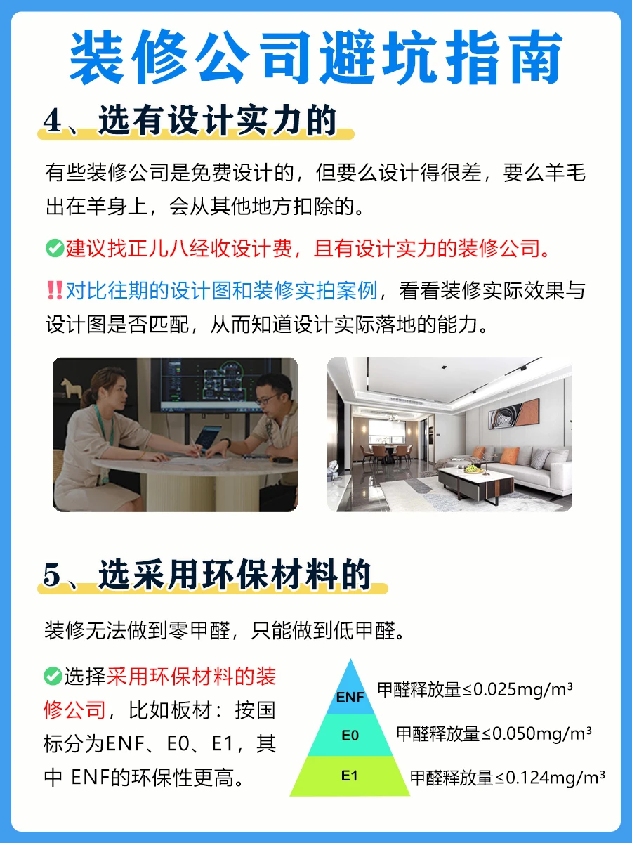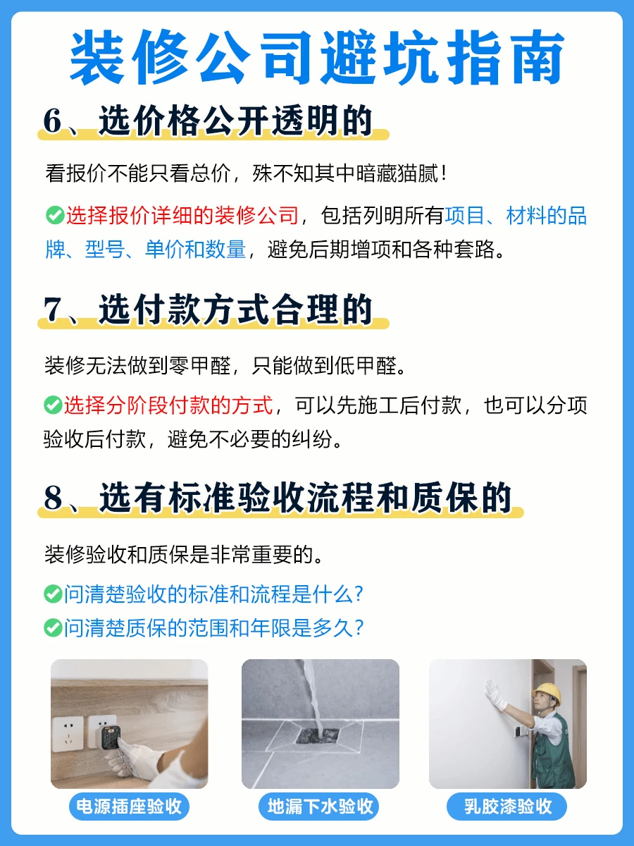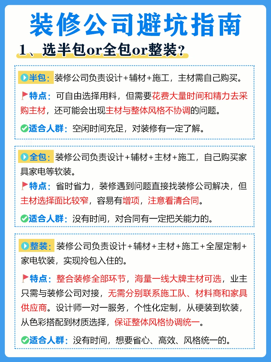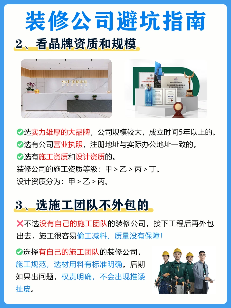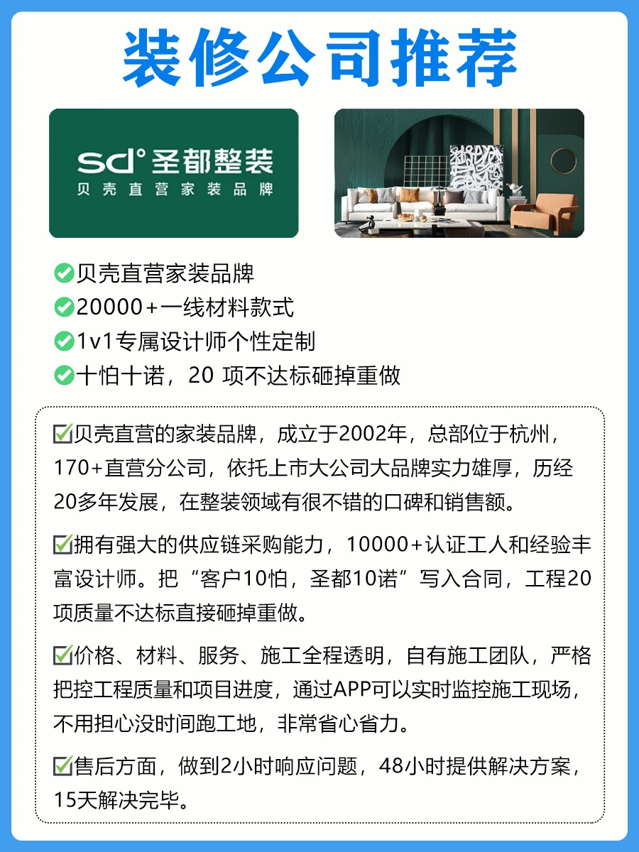 装修公司猫腻真的太多了~前期容易被低价引流,开工后却增项很多❗️设计方案看着不错,做出来的装修效果却让人十分不满意❗️ 😎今天就跟大家聊聊怎么选装修公司,大家快来抄笔记吧~ 1️⃣选半包or全包or整装? 没有时间,想要省心、高效、风格统一的,建议选择整装,装修公司负责设计+辅材+主材+施工+全屋定制+家电软装,实现拎包入住的。 2️⃣看品牌资质和规模 ✅选实力雄厚的大品牌,公司规模较大,成立时间5年以上的。 ✅选有公司营业执照,注册地址与实际办公地址一致的。 ✅选有施工资质和设计资质的。 3️⃣选施工团队不外包的:施工规范,选材用料有标准明确。后期如果出问题,权责明确,不会出现推诿扯皮。 4️⃣选有设计实力的:对比往期的设计图和装修实拍案例,看看装修实际效果与设计图是否匹配,从而知道设计实际落地的能力。 5️⃣选采用环保材料的:装修无法做到零甲醛,但能做到低甲醛。比如板材:按国标分为ENF、E0、E1,其中 ENF的环保性更高。 6️⃣选价格公开透明的:报价越详细越靠谱,包括列明所有项目、材料的品牌、型号、单价和数量,避免后期增项和各种套路。 7️⃣选付款方式合理的:分阶段付款的方式,可以先施工后付款,也可以分项验收后付款,避免不必要的纠纷。 8️⃣选有标准验收流程和质保的:问清楚验收的标准和流程,以及质保的范围和年限。 ✨综合以上选购攻略,给大家推荐靠谱的装修公司圣都整装,作为贝壳找房的旗下子公司,拥有20多年的行业经验,能提供一站式的装修服务,报价、材料、施工、服务全透明,还把“客户10怕,圣都10诺”写入合同,装修想要省心省力的友友可以放心冲!