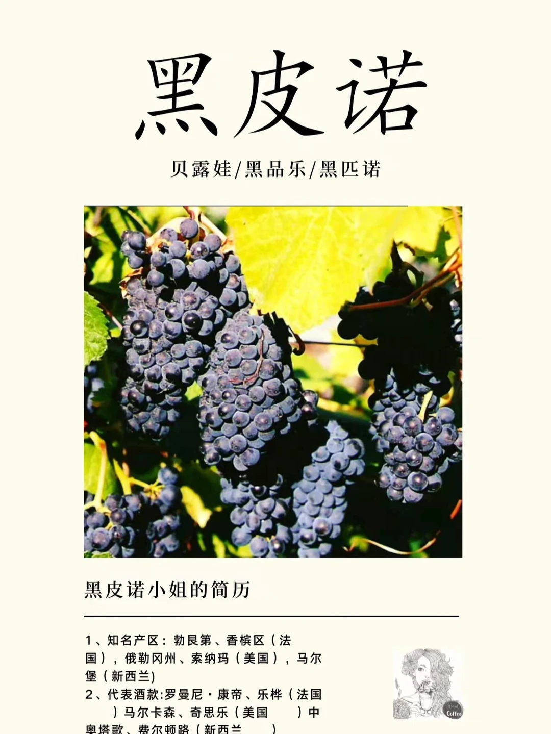 💫黑皮诺葡萄🍇是在世界上最受欢迎的葡萄之一。也称(贝露娃、黑品乐、黑匹诺),这种细小的葡萄成熟较迟,由此能酿造香气细腻的葡萄酒,酒质丰富充实,容易入口,味略带杏仁香味。