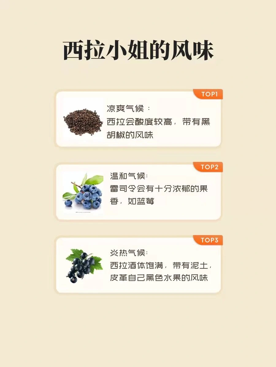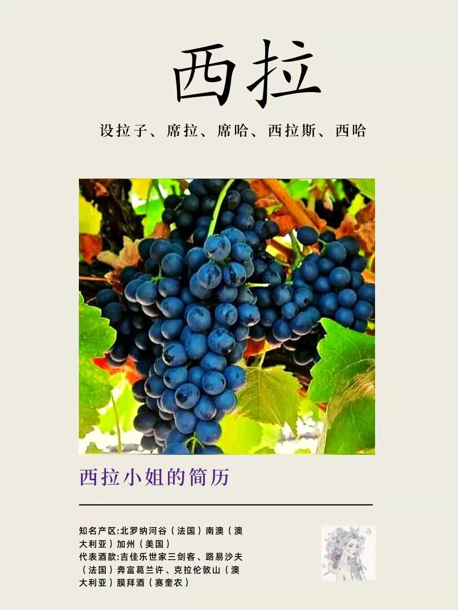 💫西拉:起源于法国罗讷河谷(Rhone)北部,主要在埃米塔日(Hermitage)和罗第丘(Cote-Rotie)产区。西拉是颜色很深的品种,经常被称为「像夜一般黑」。口感上也是偏「重口」的,西拉的酸度不太高,但酒精度、单宁都较高,酒体偏重。