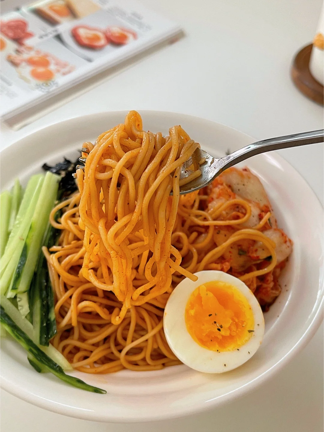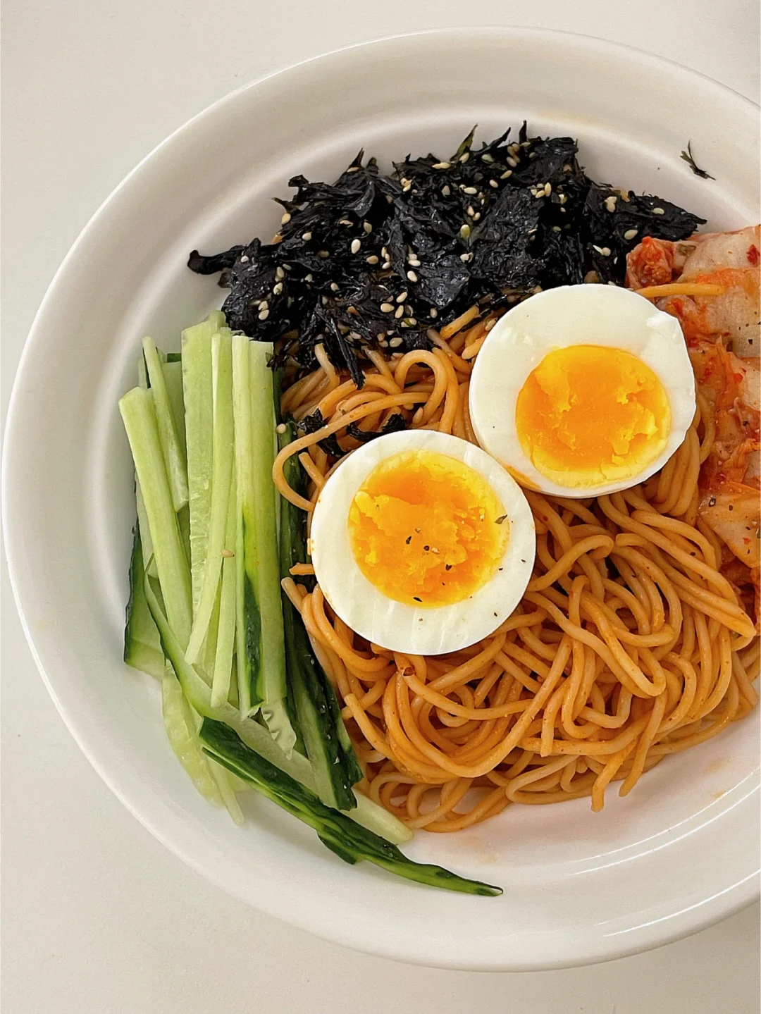 📝材料:面条,海苔,黄瓜丝,泡菜,鸡蛋