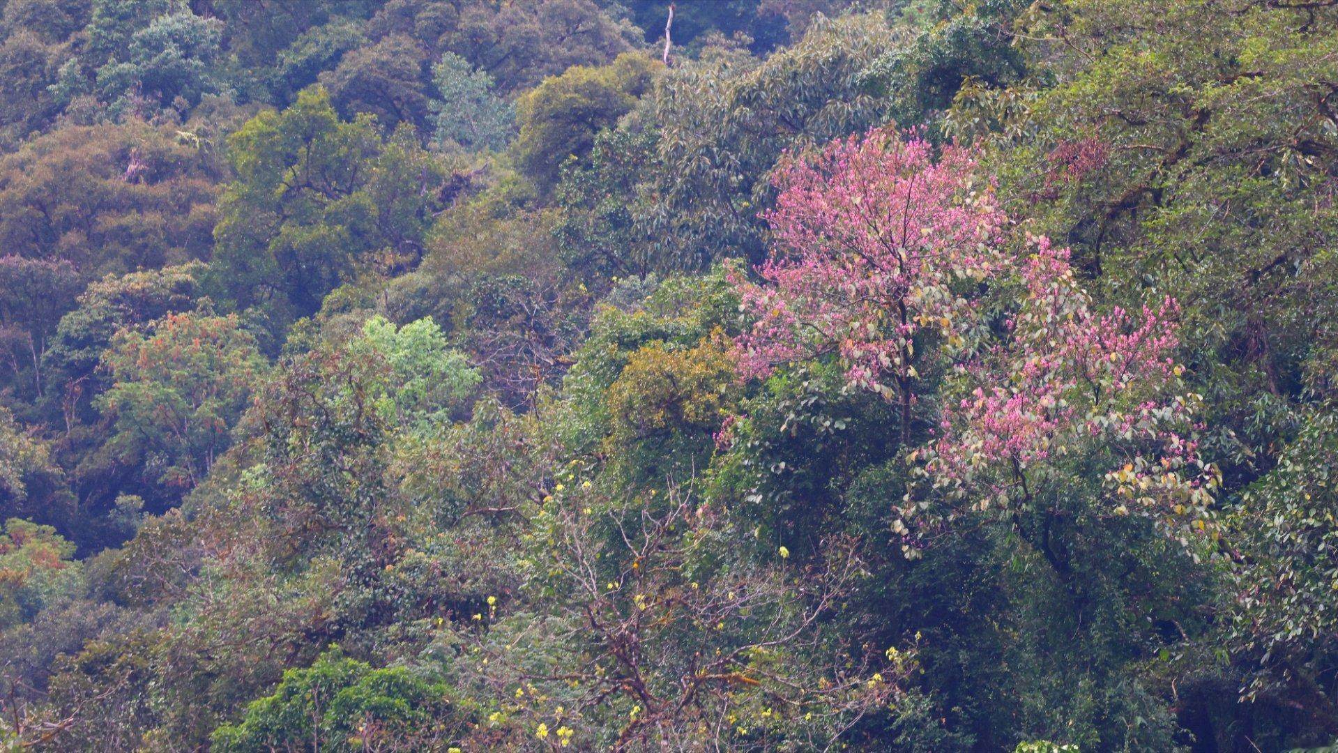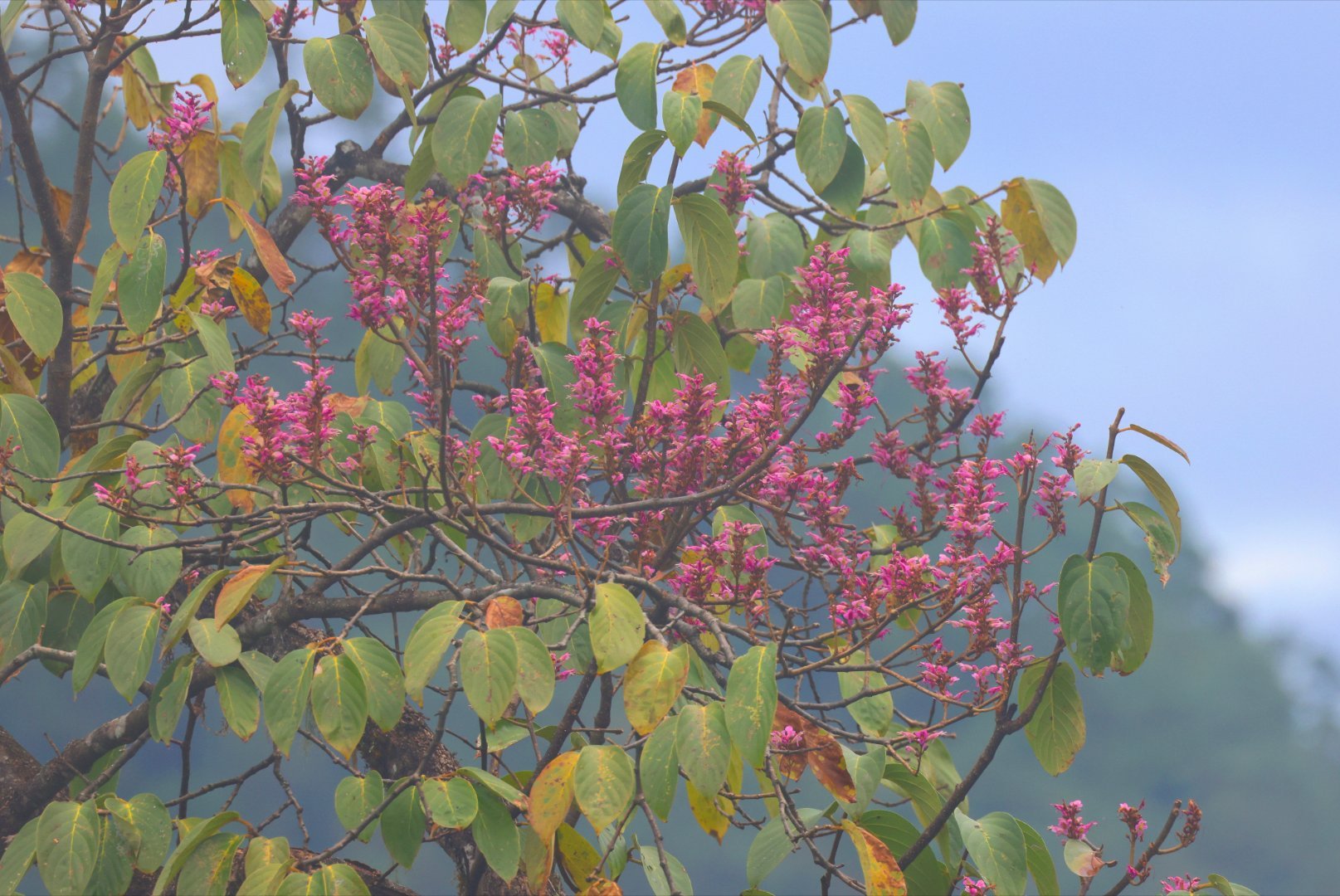 墨脱一种单科单属的珍稀树木——美丽桐,树如其名,非常美丽,是十月十一月1300-1800海拔的墨脱雨林中少有的开花树木,粉红色的花在深绿的雨林中很亮眼,虽然2012年第一次进入墨脱就记录了它的存在,但直到最近才有机会靠近观赏它;美丽桐分布其实比较广泛,从越南,缅甸,印度,云南西双版纳等地都有分布,和山地雨林之王细青皮一样,是东南亚山地雨林的标志性树种之一,值得一提的是,美丽桐属大型攀援型树木,幼年需攀援大树才能更好地生长发育,单独种植一般长的不好,这也是为什么我们的行道树和公园见不到它普及的原因之一,美丽桐和原始雨林美好的共存关系正是我们保护生物多样性的无数理由之一
