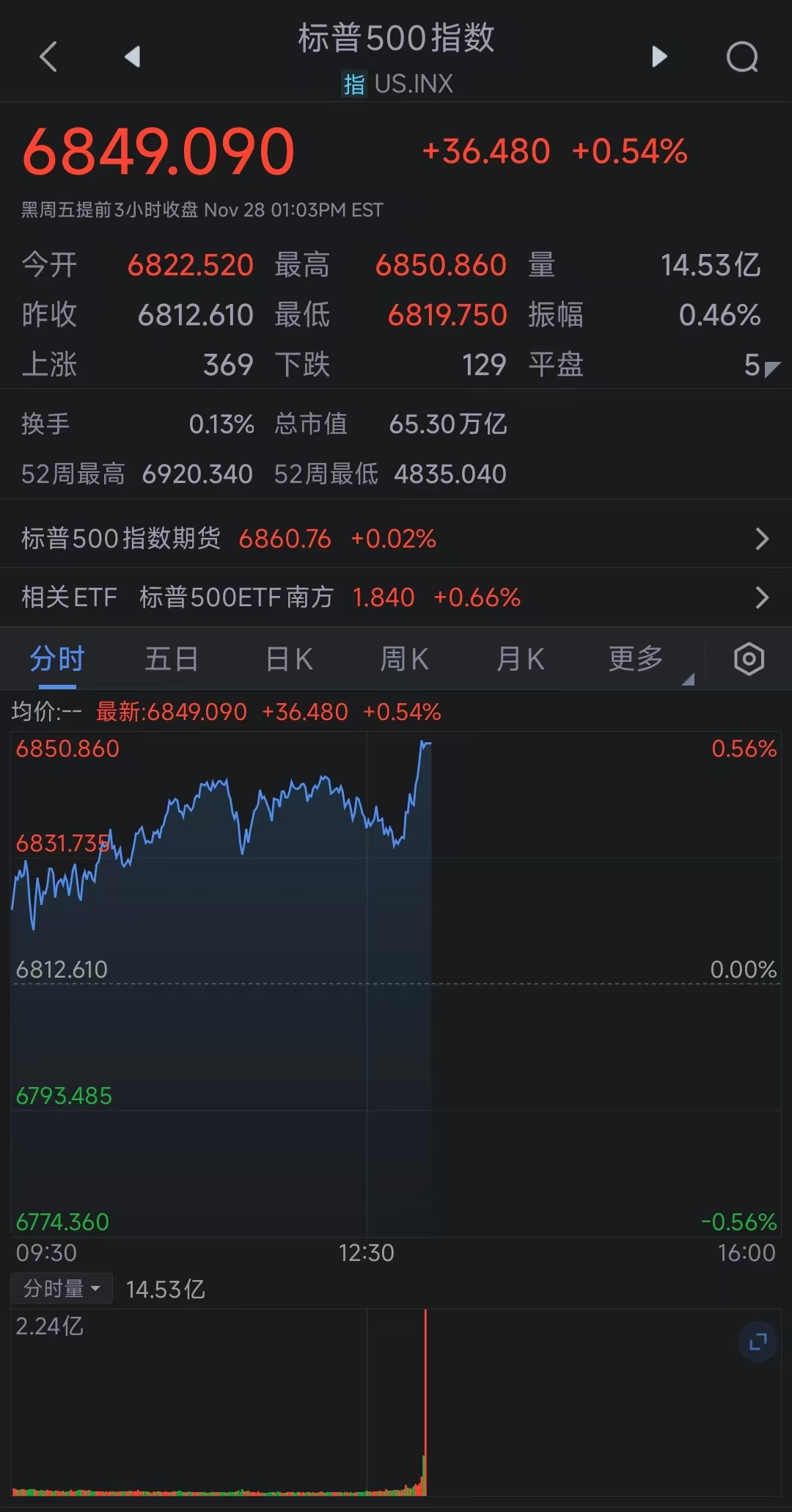 11月28日(周五)为感恩节翌日,美股提前3小时休市。美股三大股指收涨,道指涨0.61%,纳指涨0.65%,标普500指数涨0.54%。英特尔收涨超10%,天风国际证券分析师郭明錤称英特尔预计最快2027年开始出货苹果最低阶M系列处理器。本周标准普尔500指数上涨3.73%,纳斯达克指数上涨4.91%,道琼斯指数上涨3.18%。