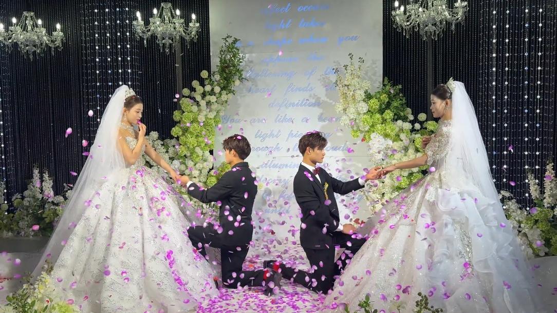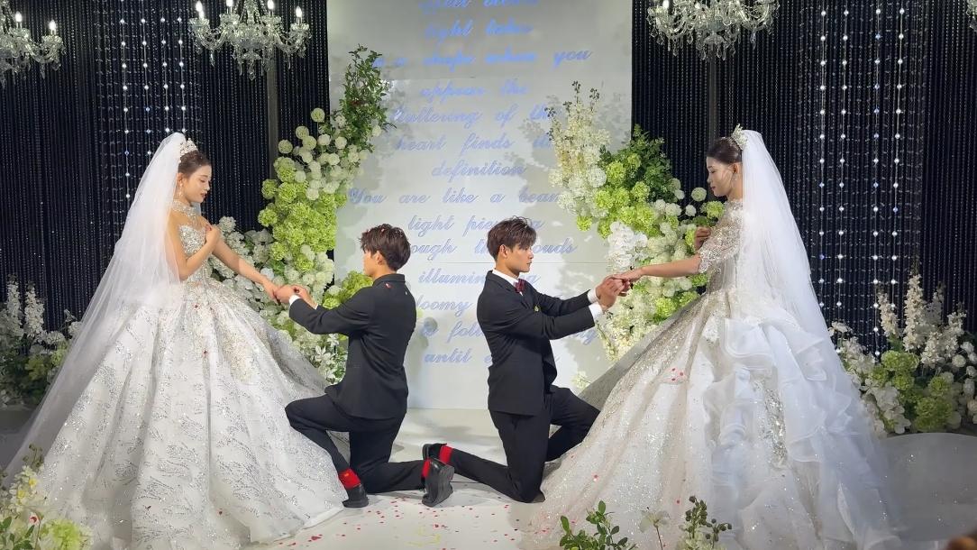 近日,河南商丘一场“双倍甜蜜”的婚礼刷爆全网!当地一对双胞胎兄弟,在同一天迎娶了一对双胞胎姐妹,两场婚礼同步举行、布置一模一样,被网友戏称“现实版复制粘贴的幸福”,引发全网热议。 据悉,这对双胞胎兄弟和双胞胎姐妹自幼相识,长大后各自暗生情愫,慢慢走到了一起。兄弟俩性格沉稳默契,姐妹俩温柔大方,四人不仅外形搭配,相处起来更是毫无违和感。双方家庭一拍即合,决定举办一场特别的联合婚礼,让这份缘分圆满落幕。 婚礼当天,两对新人穿着同款礼服,从接亲车队到现场布置,从仪式流程到互动环节,几乎完美复刻。当兄弟俩同时牵着各自新娘的手走上红毯,台下亲友纷纷举起手机记录这罕见的一幕,网友调侃:“长辈们怕是要靠衣服区分儿媳,孩子以后分不清姑姑和舅妈吧!” 更有趣的是,这场婚姻还形成了特殊的“双重亲缘”关系。未来孩子们既是堂兄弟姐妹,又是表兄弟姐妹,这种打破常规的亲属联结,让网友直呼“太奇妙”。有网友留言:“这才是真正的天作之合,基因都在组队撒糖!”也有网友羡慕:“一起长大、一起恋爱、一起结婚,这缘分简直是老天爷写好的剧本!” 两对新人表示,能和最亲的人一起步入婚姻殿堂,是人生最幸福的事。未来他们会互相扶持,把这份双倍的缘分延续下去,经营好各自的小家庭,也守护好大家庭的和睦。 这场特别的婚礼,不仅让大家见证了爱情的美好,更感受到了缘分的奇妙。网友们纷纷送上祝福:“愿这两对神仙眷侣,永远幸福甜蜜,把复制粘贴的幸福传递下去!”