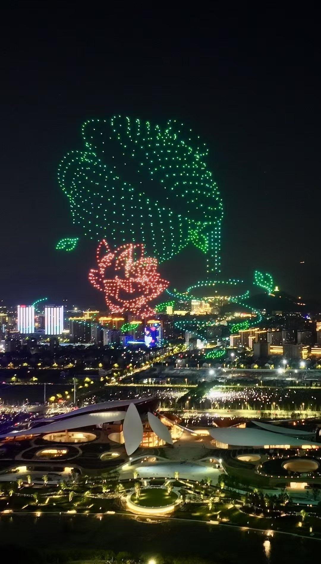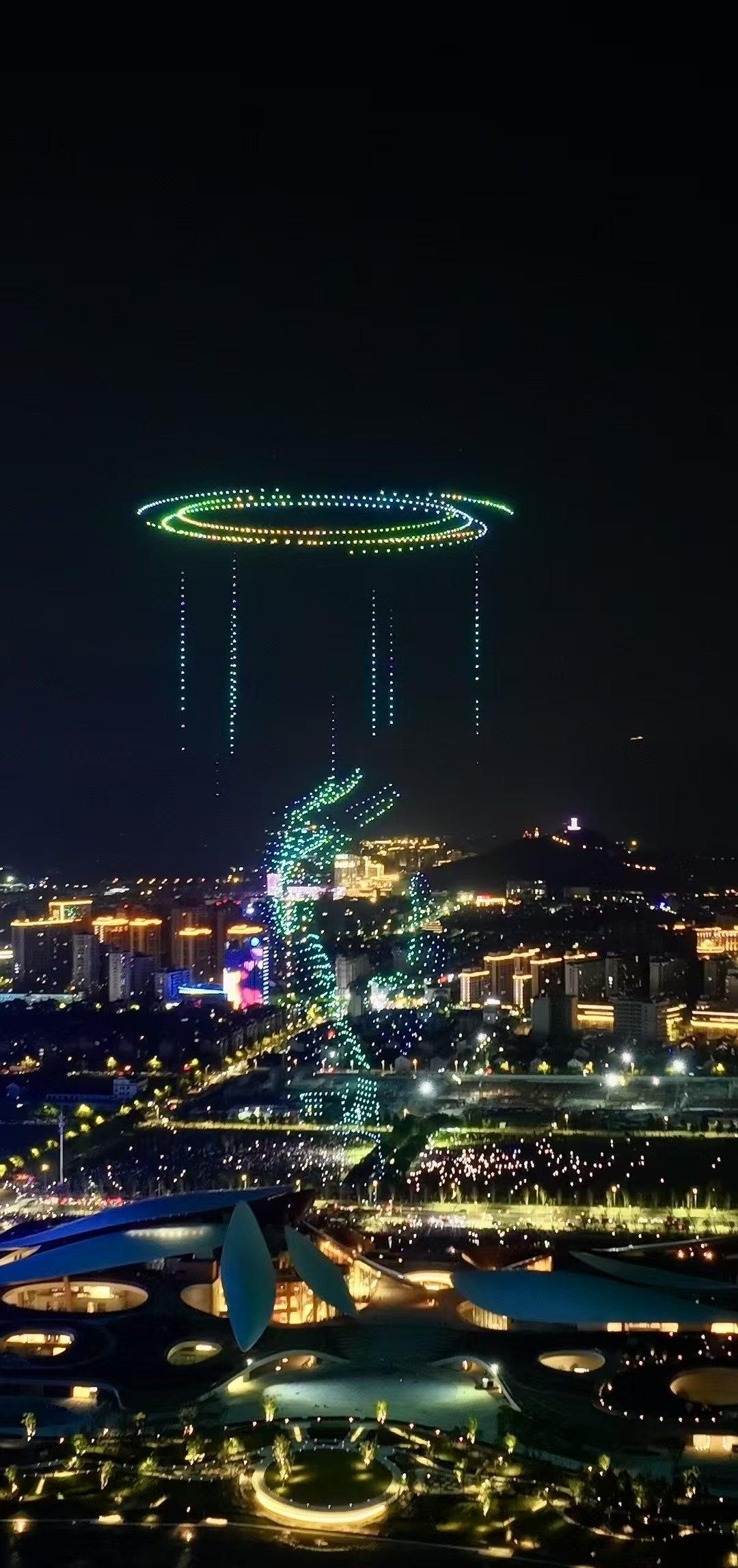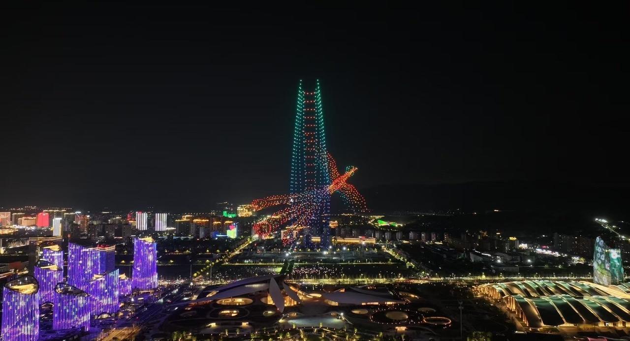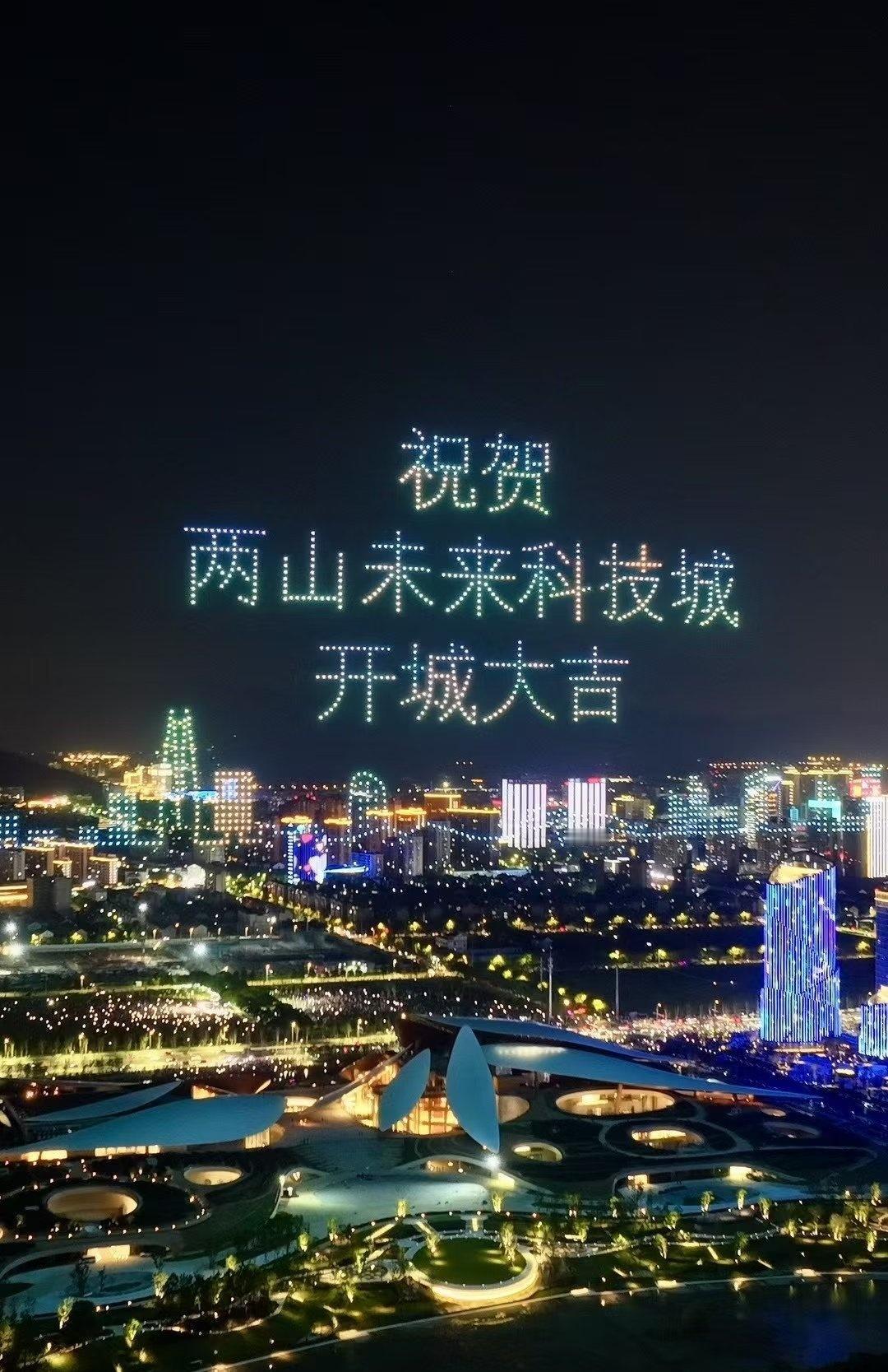 “祝贺两山未来科技城开城大吉” 字样,光影流转间,科技与浪漫交融。 地面上,未来科技城建筑轮廓被灯光勾勒,或璀璨明亮,或梦幻柔和,与天上无人机阵列交相辉映。城市路网如发光丝带,串起幢幢楼宇,车水马龙化作流动光点,诉说着蓬勃生机 。 站在这片土地,看无人机编织的绚丽图景,听周遭人群的欢呼惊叹,既为科技赋能的奇妙效果震撼,又因开城的新起点满怀期待,仿佛能预见这里将成为创新浪潮的弄潮地,孕育无数可能性,满心都是对未来的憧憬与振奋 。