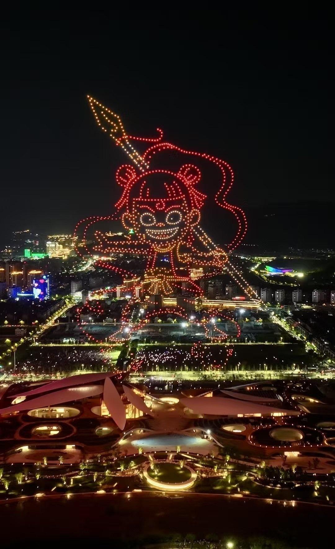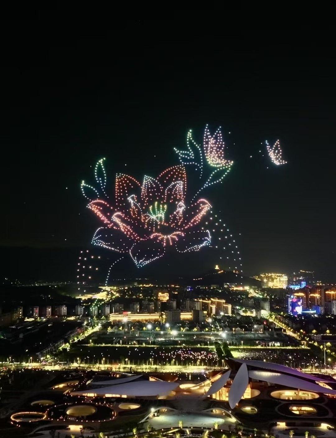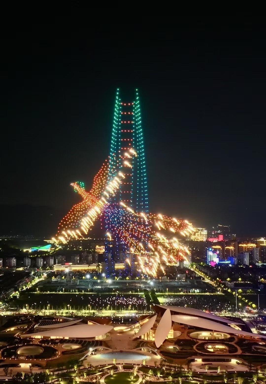 “祝贺两山未来科技城开城大吉” 字样,光影流转间,科技与浪漫交融。 地面上,未来科技城建筑轮廓被灯光勾勒,或璀璨明亮,或梦幻柔和,与天上无人机阵列交相辉映。城市路网如发光丝带,串起幢幢楼宇,车水马龙化作流动光点,诉说着蓬勃生机 。 站在这片土地,看无人机编织的绚丽图景,听周遭人群的欢呼惊叹,既为科技赋能的奇妙效果震撼,又因开城的新起点满怀期待,仿佛能预见这里将成为创新浪潮的弄潮地,孕育无数可能性,满心都是对未来的憧憬与振奋 。