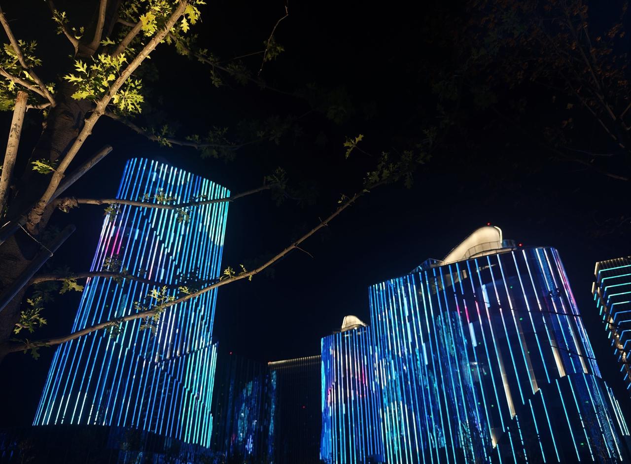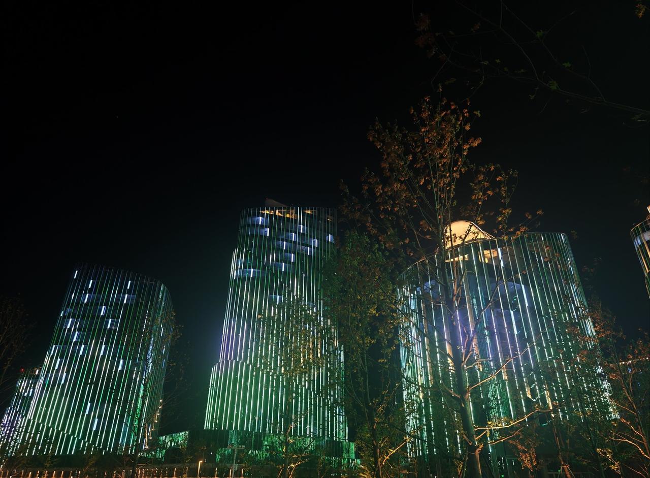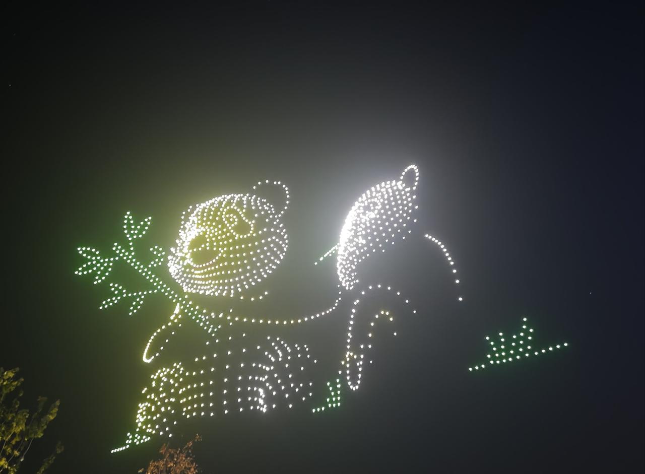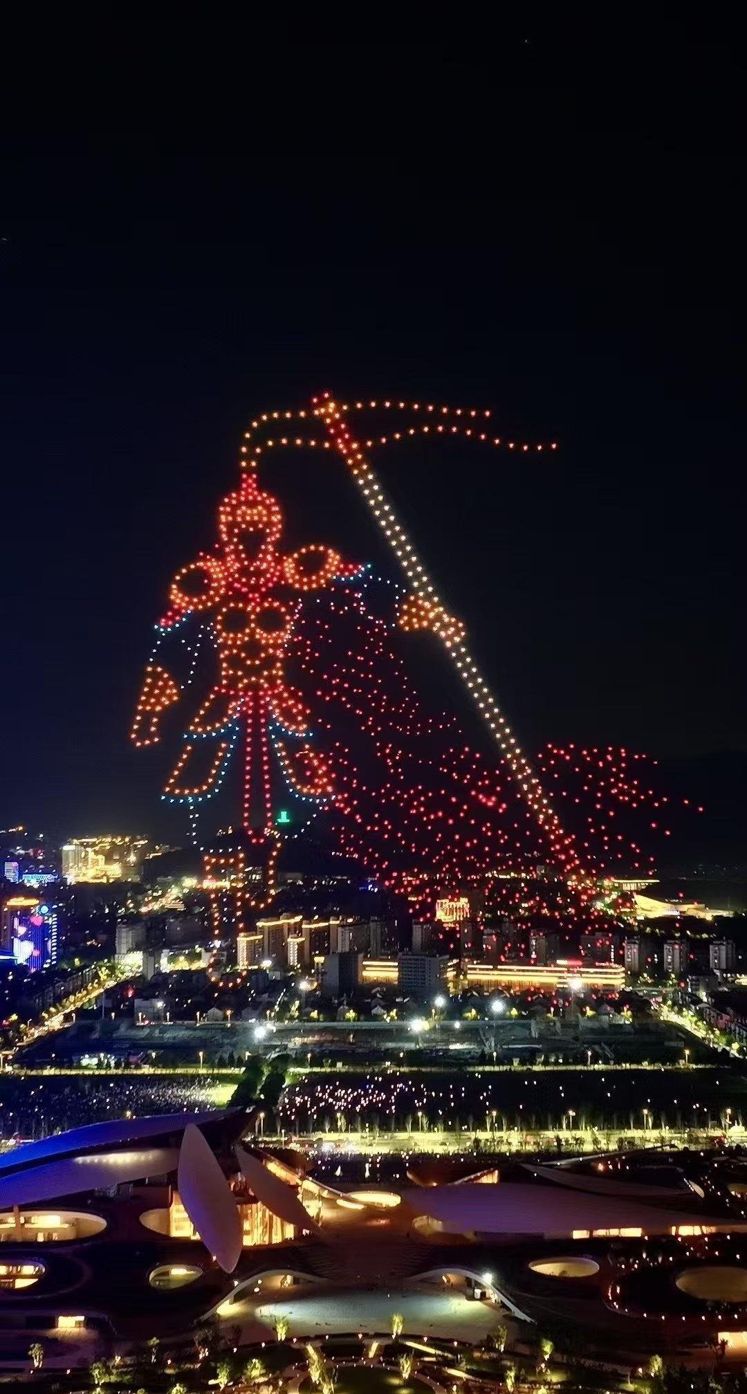 “祝贺两山未来科技城开城大吉” 字样,光影流转间,科技与浪漫交融。 地面上,未来科技城建筑轮廓被灯光勾勒,或璀璨明亮,或梦幻柔和,与天上无人机阵列交相辉映。城市路网如发光丝带,串起幢幢楼宇,车水马龙化作流动光点,诉说着蓬勃生机 。 站在这片土地,看无人机编织的绚丽图景,听周遭人群的欢呼惊叹,既为科技赋能的奇妙效果震撼,又因开城的新起点满怀期待,仿佛能预见这里将成为创新浪潮的弄潮地,孕育无数可能性,满心都是对未来的憧憬与振奋 。