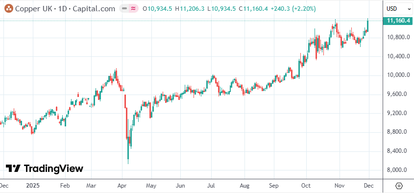 与此同时,一系列矿山中断加剧了供应趋紧,全球铜价也随之不停攀升。日内,伦敦金属交易所(LME)的期铜交易价格创下盘中历史新高,美国期铜也明显走强。