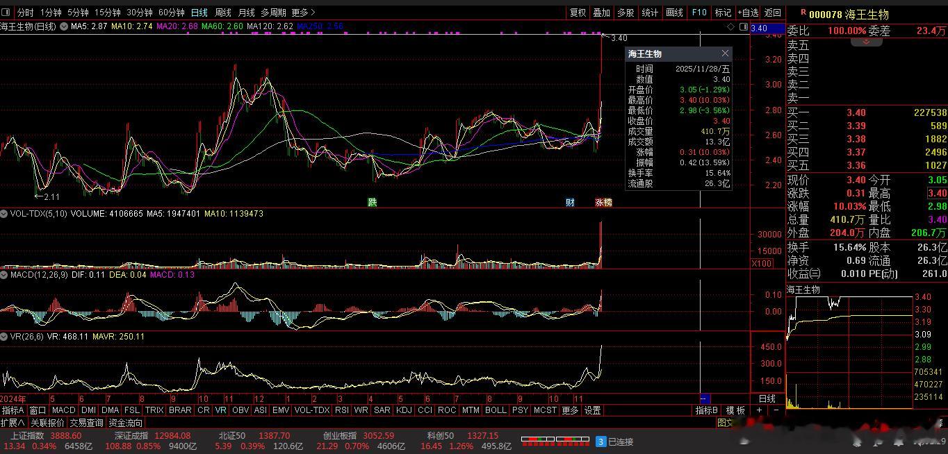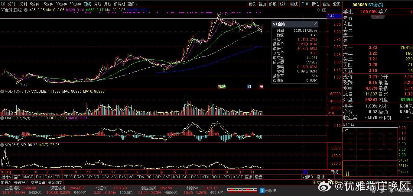 【财富晚茶】三元股市收评:沪指涨0.34%:航天强势上扬医美探底导语:作者系《网易号》优质财经领域创作者。曾经原创作者和知名网易号旅游领域创作者。大跨度行业等的写作,颇受网友喜爱。作品发表于2025.11.28.15:18优雅端庄晚风。一、佳隆股份:九年箱底002495 佳隆股份 盘中05涨1、九年筑底:今年突破今日视野:前期双顶:蓄势突破。2025-11-28 :截止15:00:收盘股价:3.07元,上涨0.33%。成交总量:200.90万手。成交金额:6.20亿元。总换手率:28.66%。总市值达:28.72亿元,流通市值:21.51亿元。2、鸡粉鸡精:股权投资主营业务:鸡粉、鸡精产品的研产和销售。公司品牌:行业内第一民族品牌。3、营收净利:每日况下业绩减亏:2025-09-30 三季度报:公司营收:1.7746亿 同比增-4.48%,实现净利润1114.1284万 同比增-29.92%。二、多空搏杀:沪深红盘1、追踪盘面:蛛丝马迹沪深场景:早盘:低开四跌,四涨一跌。午盘:三跌三涨,一跌四涨。尾盘:触底反弹,最高红盘。看点之一:沪深股指:早盘低开,瞬间杀跌,尾盘回升。看点之二:一枝独秀:科创50指:盘中超强:最高涨1.42%。看点之三:沪深北市:合计成交:15858亿元。场内个股:4122股飘红。2、板块涨跌:风口依然涨跌观察:板块见证。板块拉升:林业、冶钢原料、能源金属、种植业等。板块回调:油气开采、全国性银行、中药等。概念活跃:钛金属、风沙治理、南海自贸等。3、技术看盘:涨跌位置观K线提示:精彩多空博弈。12月01日:沪指突破阻力:03888点看涨,前程似锦;跌破支撑位:03856点看跌,日暮途穷。深指突破阻力:13000点看涨,鹏程万里;跌破支撑位:12834点看跌,不堪造就。三、三元板块:风口潜水1、追踪盘面:视角视野三元强势,沪深脉冲。99股上涨,涨幅5%以上:9股涨停板。9股下跌,跌幅5%以上:0股跌停板。涨幅0%:0股0停板。涨幅0.00%+上涨个股:0+99=99股票赚钱。沪深两市:合计成交17097亿元。总体归纳:三元股票:盘口强势。2、追踪盘面:主力进退换位思考:沪强深弱,尾盘兑现。沪指距9:31-15:00:前2小时放量盘升,中1小时略量盘跌,后1小时略量盘升。深指距9:31-15:00:前2小时放量盘升,中1小时略量盘跌,后1小时略量盘升。沪深两市:合计成交:15858.40亿元。四、透析个股:聚焦涨跌1、涨幅榜眼:处排查摸主旋律:涨幅榜之中:寻找启动600337 美克家居 000078 海王生物 000669 ST金鸿涨幅榜-1:600337 美克家居主营业务:家具-配套家居的研产和销售。公司品牌:多品牌多渠道一体国际综合家居消费品头部公司。涨幅榜-2:000078 海王生物主营业务:生物生化制品-海洋药物-海洋生物制品-中成药研造和销售。公司品牌:国内实力雄厚综合性大型医药他头部企业。涨幅榜-3:000669 ST金鸿主营业务:天然气。公司品牌:国内最具实力的综合性清洁能源服务商。2、跌幅榜眼:处排查摸主旋律:跌幅榜之中:寻找金子600307 酒钢宏兴 300237 ST美晨 300301 *ST长方跌幅榜-1:600307 酒钢宏兴主营业务:钢铁-压延产品产销。公司品牌:西北综合竞争力最强的钢铁企业。跌幅榜-2:300237 ST美晨主营业务:橡胶非轮胎-园林绿化D 研产和销售。公司品牌:国内外非轮胎橡胶制品重要综供商和头部企业。跌幅榜-3:300301 *ST长方主营业务:LED照明光源器件。公司品牌:LED照明光源器件头部企业。3、潜力榜眼:处排查摸主旋律:潜力榜之中:寻找估值002496 *ST辉丰 300301 *ST长方 000669 ST金鸿潜力榜-1:002496 *ST辉丰主营业务:生物农资-农资电商-石化仓储供应链-项目投资。公司品牌:中国领先亚临界小分子高温裂解工艺高科技专利产品和头部企业。潜力榜-2:300301 *ST长方主营业务:LED照明光源器件。公司品牌:LED照明光源器件头部企业。潜力榜-3:000669 ST金鸿主营业务:天然气。公司品牌:国内最具实力的综合性清洁能源服务商。五、本创作者:优质网易投资投机迷茫之中:给予尽可能有帮助:资本市场风险自负。(优雅端庄晚风《网易号》优质财经领域创作者和原创作者; 违者必究)