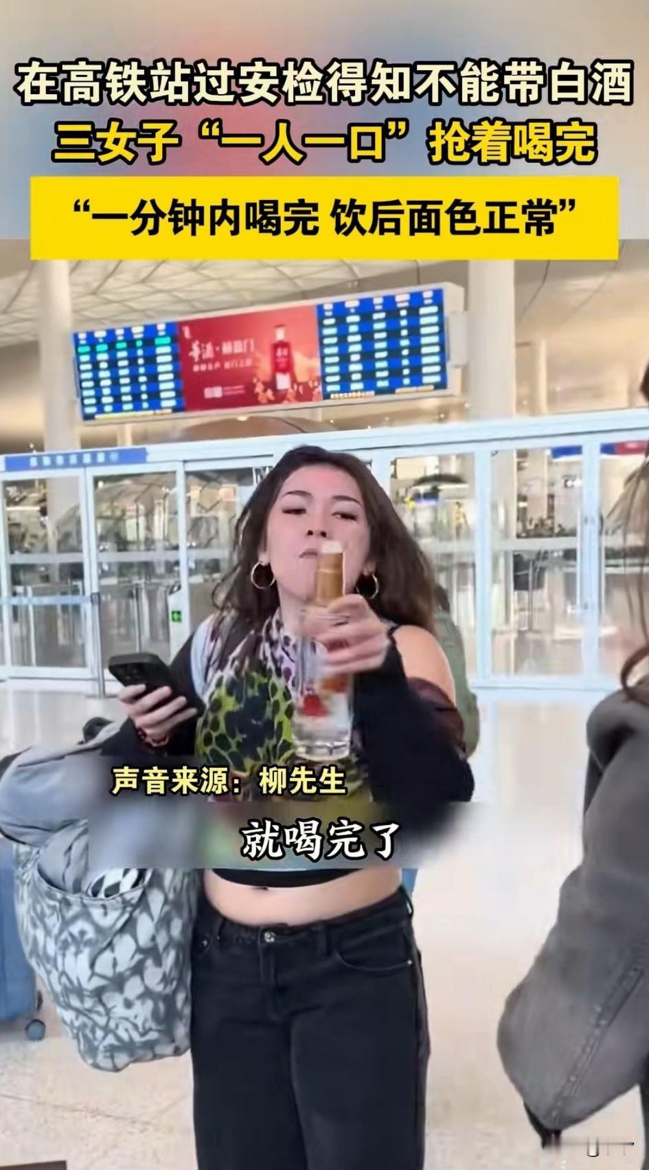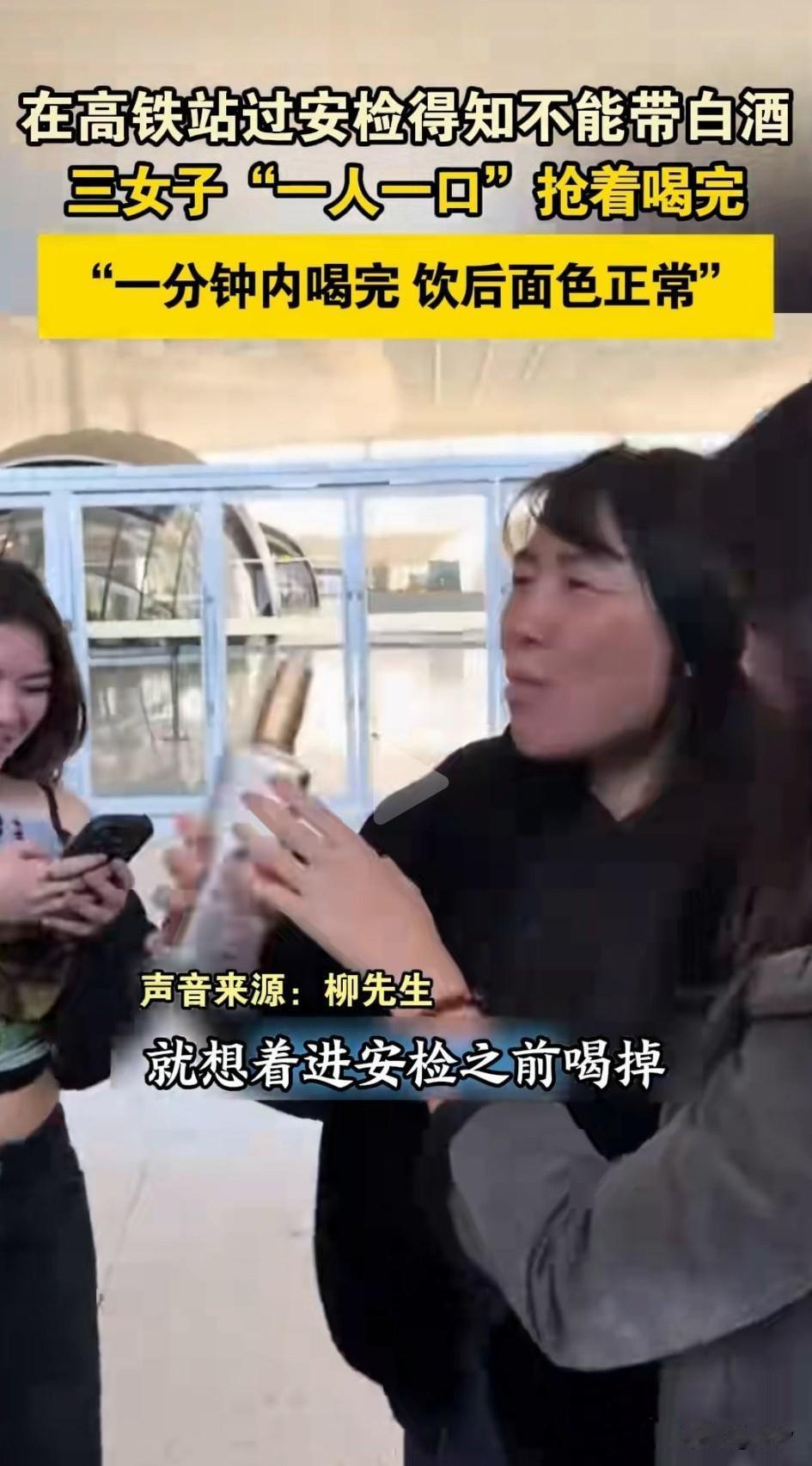 杭州高铁站, 外面女子带了半瓶白酒, 无法通过安检, 于是女子直接拿起半瓶白酒喝了起来, 美女带头喝了几口, 递给了另一个女生, 另一个女子也猛灌了几口, 接着传给了下一个女生, 三人就这样一人几口就把半瓶白酒喝完了,而且面部毫无变色, 周围的旅客都被惊呆了, 纷纷称赞她们为女中豪杰, 有些女子就是会喝酒, 这样的女生一般都很豪爽, 不知道是不是东北女生? 按理来说东北女生喝酒都很猛, 这三个女生喝酒完全不输男性, 大家对于三个女生上高铁前当场喝完半瓶儿白酒怎么看? 乘高铁那些事 论高铁上的尬事 女人喝酒真的喝不过男人吗