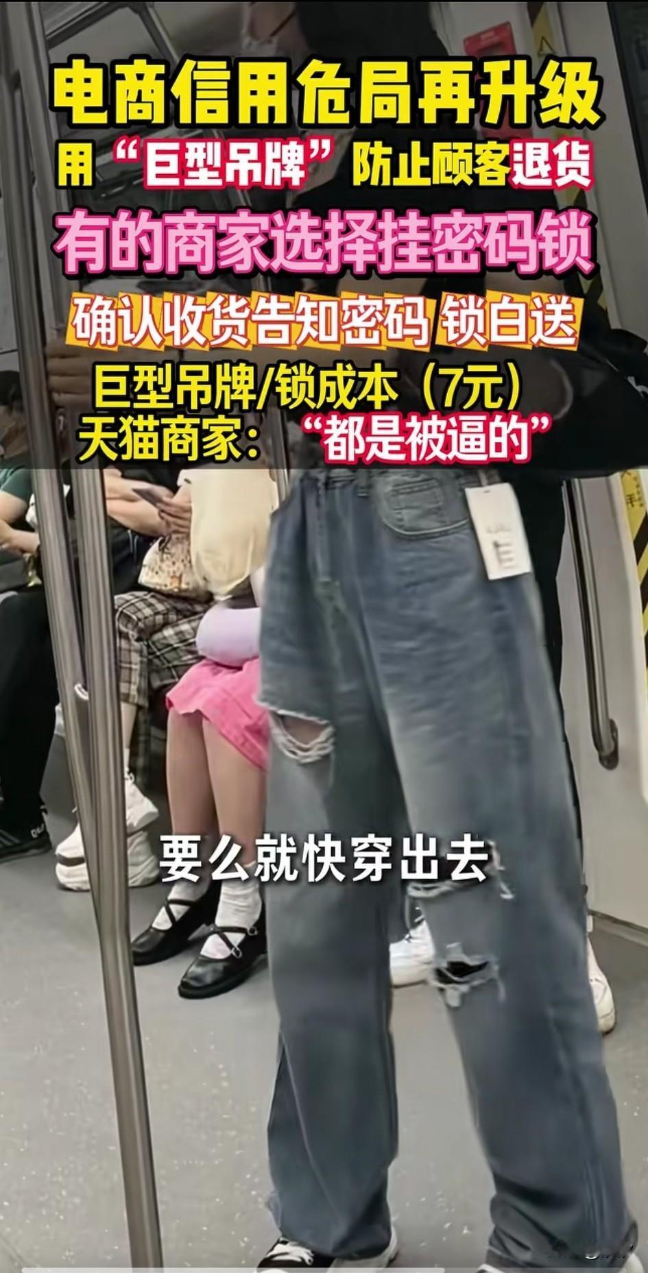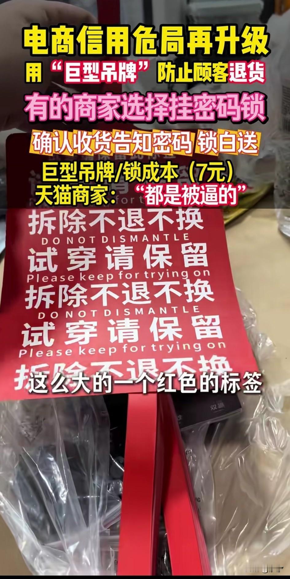 电商信任危机再升级, 许多天猫商家把衣服上面挂了巨形锁, 是为了防止有些女生, 买完衣服不摘吊牌穿几天, 然后直接7天无理由退货, 看来是把商家逼急了, 女装退货率居高不下, 就是这些女生想要白嫖新衣服, 她们穿过几天的衣服非常脏, 在大街上看到一些女生衣服上面还有吊牌,这就是妥妥的白嫖党, 商家为了降低退货率, 没办法只能挂巨型吊牌, 有些甚至用密码锁锁住吊牌, 确认收货后再告诉密码, 密码锁的成本7元, 卖衣服白送密码锁, 现在的女生真的把电商逼疯了! 大家对于女装这么高的退货率怎么看? 网购女装退货率 电商女装退货率 天猫欺诈消费者 女装退货率80 天猫保价骗局