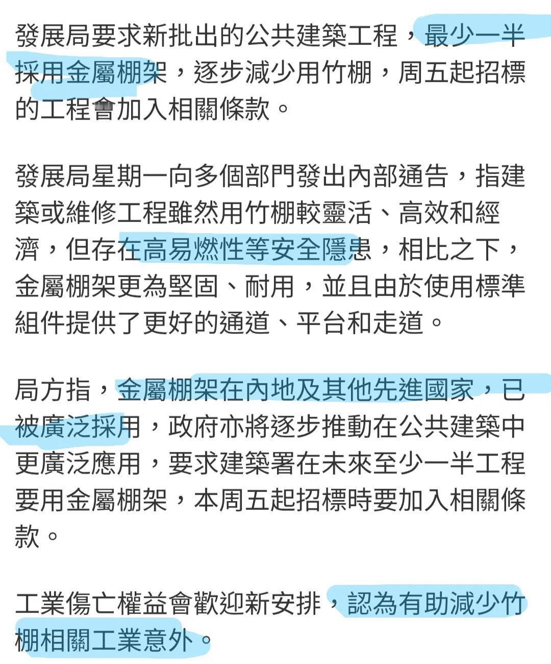 香港特区政府的初步调查已经出来,棚网保护网其实是阻燃的材料。 但是,发泡胶板却是助燃的,而更重要的是之前一直受到广泛争议的竹棚脚手架,再一次被证明是经高温导致了大量燃烧,它们不但燃烧,还阻断了消防通道,令救援无法顺利实施。 竹子是可燃物,不是易燃物。不管怎么,竹子是燃烧事故的元凶之一,而且是妨碍救援的主要因素。 个人看法来说二句。用铁手脚架与竹子各有优缺点的,竹子便宜好运输。香港面靠海铁的也不好存放。我认为不可以单方面否定的。