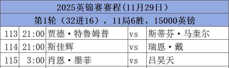 2025英锦赛,明日赛程,斯佳辉揭幕战vs瑞恩-戴! 11月29日,英锦赛正赛正