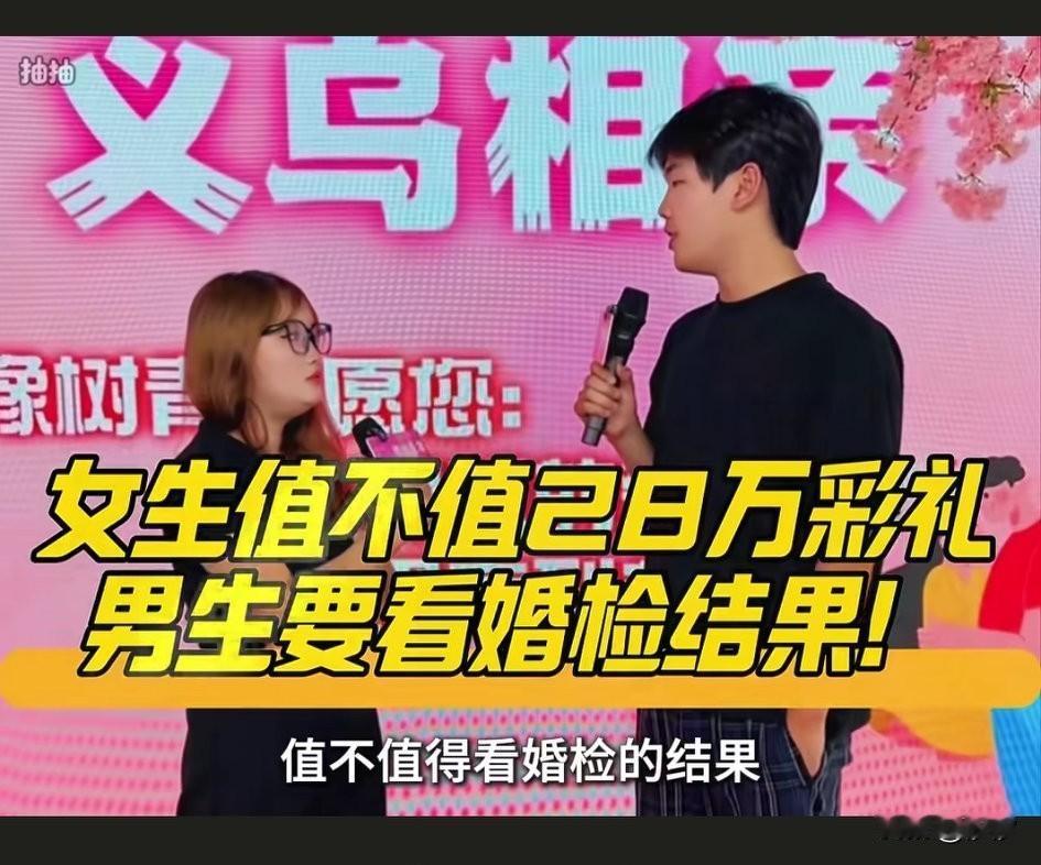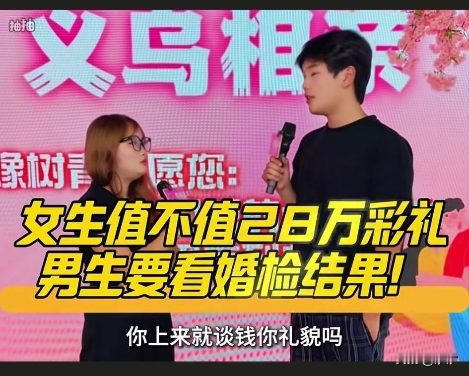女生值不值28万彩礼? 男生要看婚前结果! 义乌相亲现场, 惊现28万彩礼钱姐, 上台第一句就问男嘉宾, 觉得她值不值28万彩? 男嘉宾愣了2秒, 甩出了王炸, 那你要做婚检? 我需要看混检的结果, 这可把女生气坏了, 这女生一看面容就不是好好过日子主, 表示男方没有礼貌, 男方也不惯着她, 表示你一上来就问彩礼,你礼貌吗? 这样就像做生意, 那做生意就需要满足对方的要求, 做个婚检很正常, 不知道该女生为什么这么生气, 毕竟现在很多女生玩的都很开, 女生听到男生坚持要做婚检, 生气的头也不回直接离开了现场, 大家对于28万彩礼姐怎么看? 相亲交友 婚姻彩礼观 彩礼差异大 情侣彩礼 彩礼陷阱 婚礼彩礼观