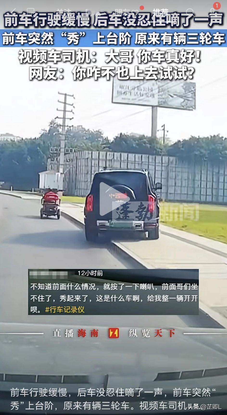 后车“滴”了前车一声,下一秒前车竟开上人行道!看清前面的景象,后车瞬间尴尬:大哥,你车真好! 11月28日,四川,某条城市道路上,网友驾车经过时,发现前面一辆SUV车行驶缓慢,实在忍不住的时候,就摁了一下车喇叭,“滴”了一声,提醒前方车主。 原本,网友以为,前面的车主会不会是在打电话,或者刷视频、回信息,所以车速不知不觉就慢下来? 没想到,很快,魔幻的一幕出现了。 明显,前方车主听到了后面视频车的提醒,紧接着车辆右转,直接开上了马路牙子,借道人行道。 视频车主这才发现,原来前车前面有一辆三轮车,正在悠哉悠哉的开着,浑然不知自己已经造成了道路拥堵。 再看那辆“秀”上台阶的SUV,一脚油门直接越过三轮车后,轻松下台阶,窜在三轮车前面,绝尘而去。 视频车主,不由得感叹一声:大哥,你车真好! 评论区的网友们也纷纷戏谑视频车主: “你咋不也上去试试?” “要是我,就上路牙子等视频车过去,然后跟在后面滴滴他!” “真让你了,你又不敢走。” “你以为我不想快吗?前面有障碍物呀!” “后面的车就会看到,你前面车开那么快,你却慢悠悠的。” “这下尴尬了。” “你倒是跟着他。” “你倒是飞过去啊,你不是滴得很厉害?” “留下一脸懵逼的自己。” “前车太有素质了,既让了后车,又躲了前车。” “行了,现在轮到你被后面的车滴滴了。” 也有清醒的网友说,“我从不滴前面,前面跑得慢一定有原因,他能够让你都让了,确实让不了肯定有障碍。” 确实,现在有人因为开车打电话、发信息或者等红绿灯时刷视频,车速慢,或者绿灯了也不发动车。但绝大多数车速慢都是有正常的原因。 像视频中的情况,前车除了开上马路牙子,能绕过去,他也没别的方式可以过去。 但马路牙子也不是你想上就能上的,首先得马路牙子足够宽还没障碍物,其次也就是最重要的,你的车能开的上去,不然,就得跟视频车一样,只能干瞪眼。 或许,还得享受刚才前车的待遇,被自己后面的车一路滴滴。 开车上路,什么样的情况都有可能遇到,但宁慢勿快却是一定要警钟长鸣。 前车虽然很潇洒的扬长而去,但其实也是一种危险行为,一个不慎,可能会触发意外或者伤害车辆。 后车虽然只是一个善意“滴”声,但也有可能会引起前车的暴躁。这个“滴”声的功能,能不使还是不使,迫不得已用的时候,短促、轻声的“滴”一声是友好的提醒,而长鸣、重按则充满了愤怒和指责的意味。 毕竟,行驶中,我们既是前车的后车,也是后车的前车。 今天你滴滴别人,明天可能就被别人滴滴。多一份理解,道路就会多一份和谐。 信息来源于直播海南,侵联删! 带定位晒今日生活 我的今日状态:🏃➡️运动 我这里的天气:☀️晴天