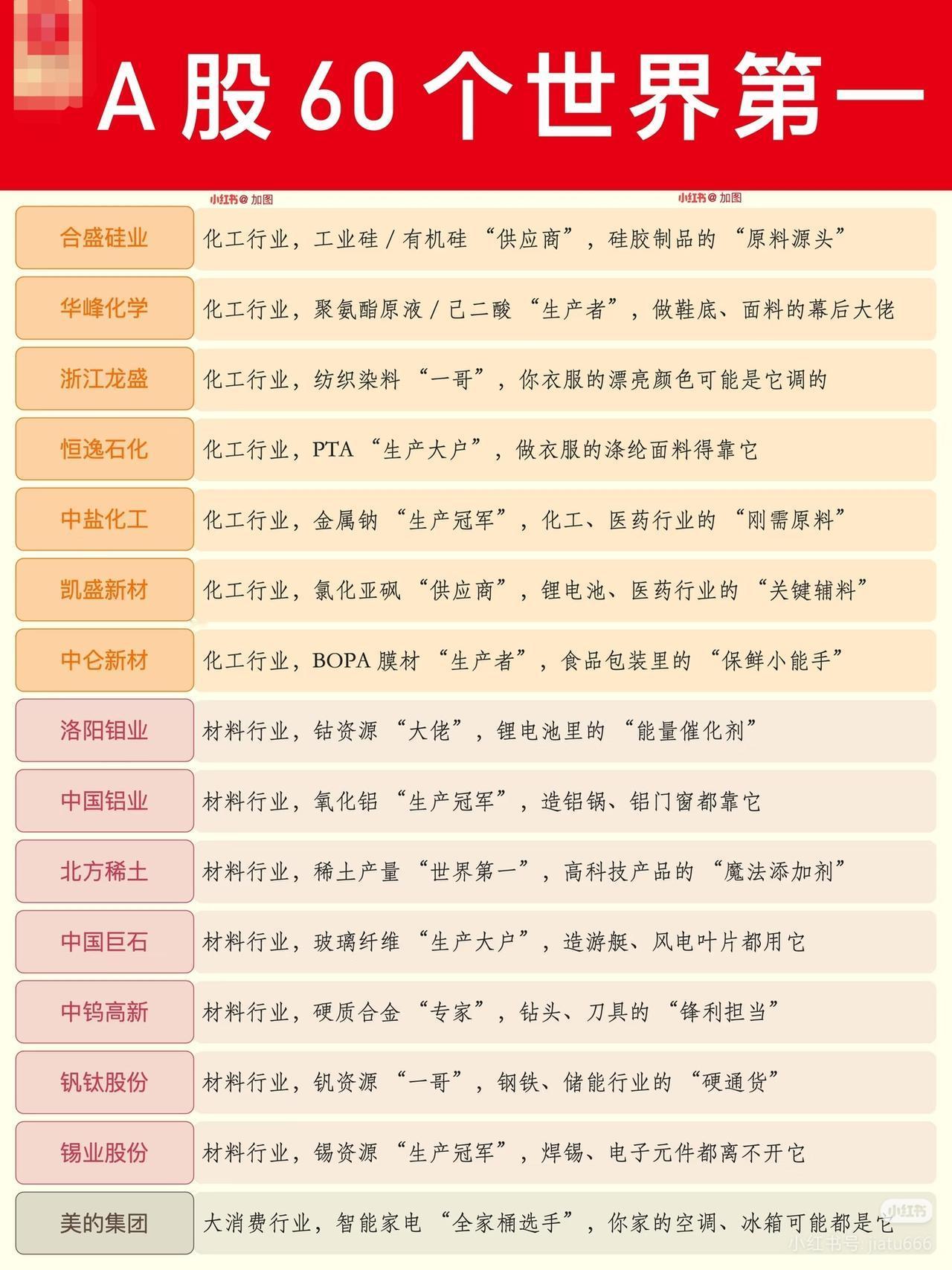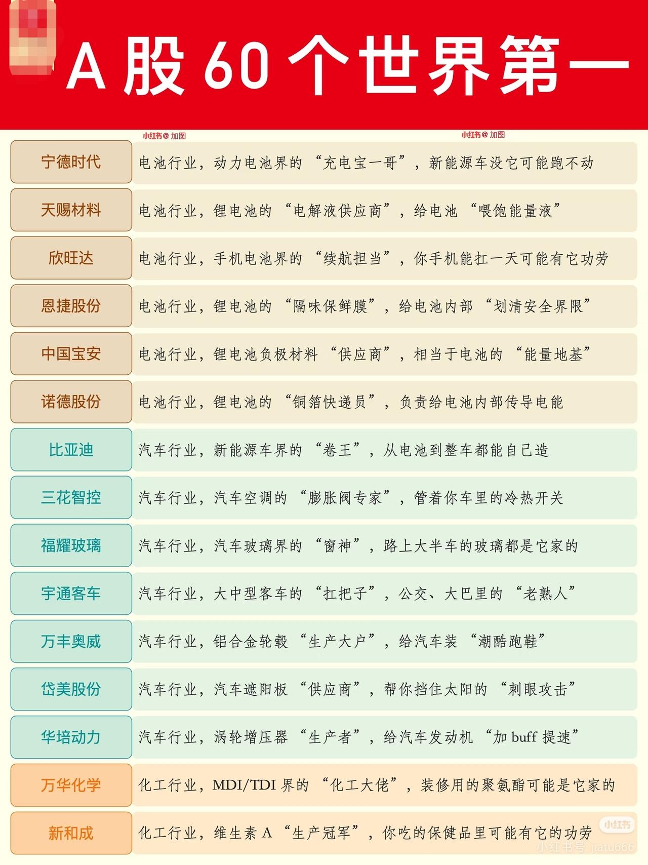 围绕“A股60个世界第一”展开,集中展示A股市场部分企业在全球多领域的领先地位。涉及新能源(动力电池、光伏、风电等)、汽车、化工、家电、电子、机械设备、港口航运、材料、大消费等行业,列举了宁德时代(动力电池/储能电池)、比亚迪(新能源车)、格力电器(分体式空调)、隆基绿能(单晶硅片)等企业,分别标注其“世界第一”的具体领域(如产能、技术、规模等),突出A股企业在全球产业链中的核心优势。