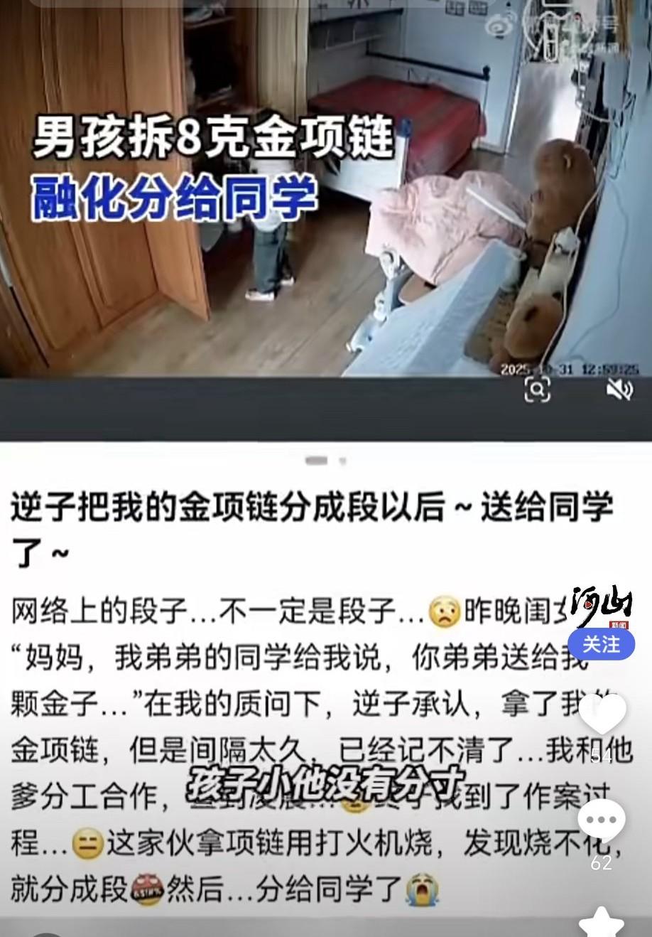 山东枣庄8岁男孩把妈妈近8克的金项链拆分成小段,当“金豆子”送给同学。这金项链是爸爸送妈妈结婚纪念日的礼物。妈妈从女儿口中得知此事后,调监控发现,一个月前儿子就从抽屉翻出项链,用打火机烧、用牙咬,再分段送人。如今孩子记不清都给了谁,也说不清项链去向,仅找回一小段。事发当晚孩子爸爸气得揍了他一顿。 有网友留言:小朋友视金链如粪土,从小就能拉拢一群小伙伴,长大了必成大器。家里应该很有钱,不差钱的那种。贵重物品随处放,普通家庭贵重物品都藏的严严实实的。 有些儿女,生下来就是来讨债的。你说孩子小不知道金项链的价值吧,他又懂得融化后分段送给朋友们,还挑了根最细的。这事儿也给家长们提个醒儿,孩子对物品价值没概念,得把贵重物品妥善收纳,与其打骂孩子,不如提前做好物品管理和教育。