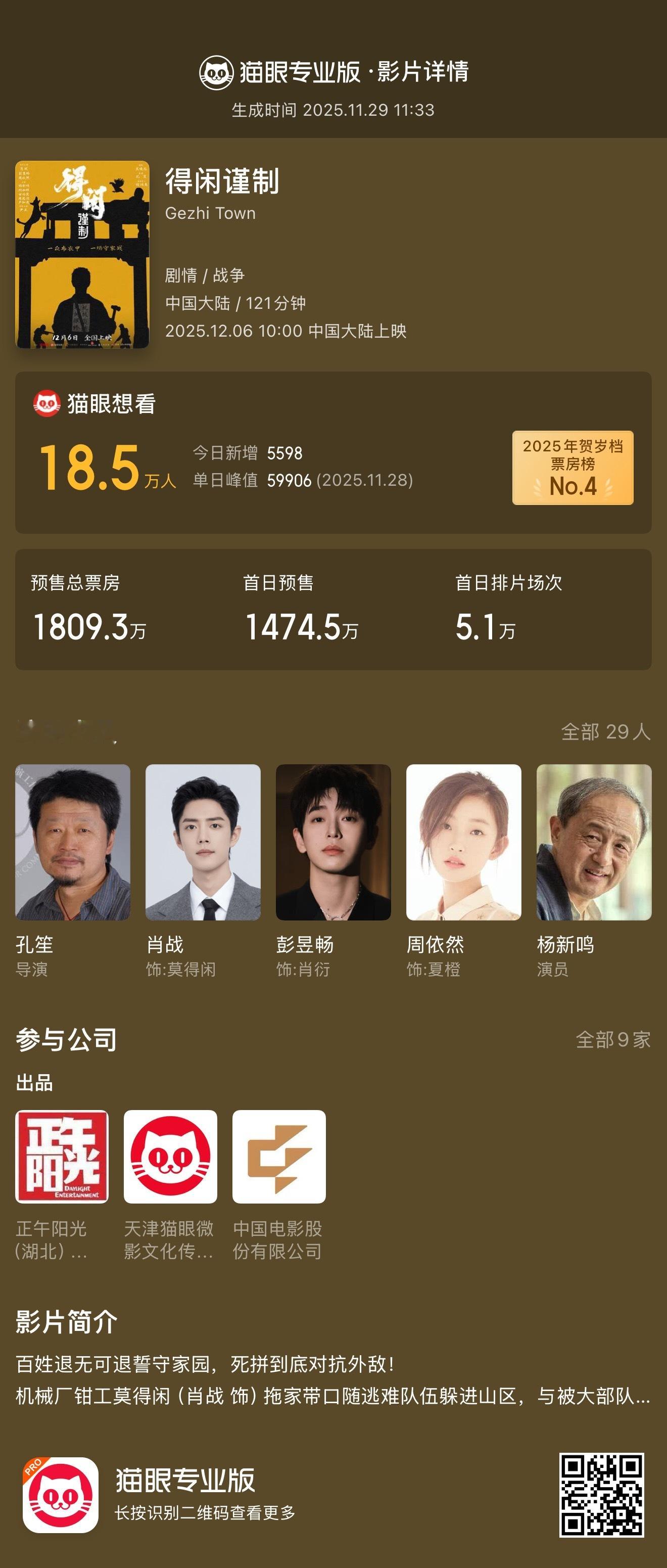 电影得闲谨制片长121分钟 据猫眼专业版数据,肖战、彭昱畅、周依然领衔主演电影《得闲谨制》定档12月6日上映,发行通知释出!片长121分钟,2025年12月6日 10:00起片,截至当前预售总票房已超1800万。得闲谨制发行通知