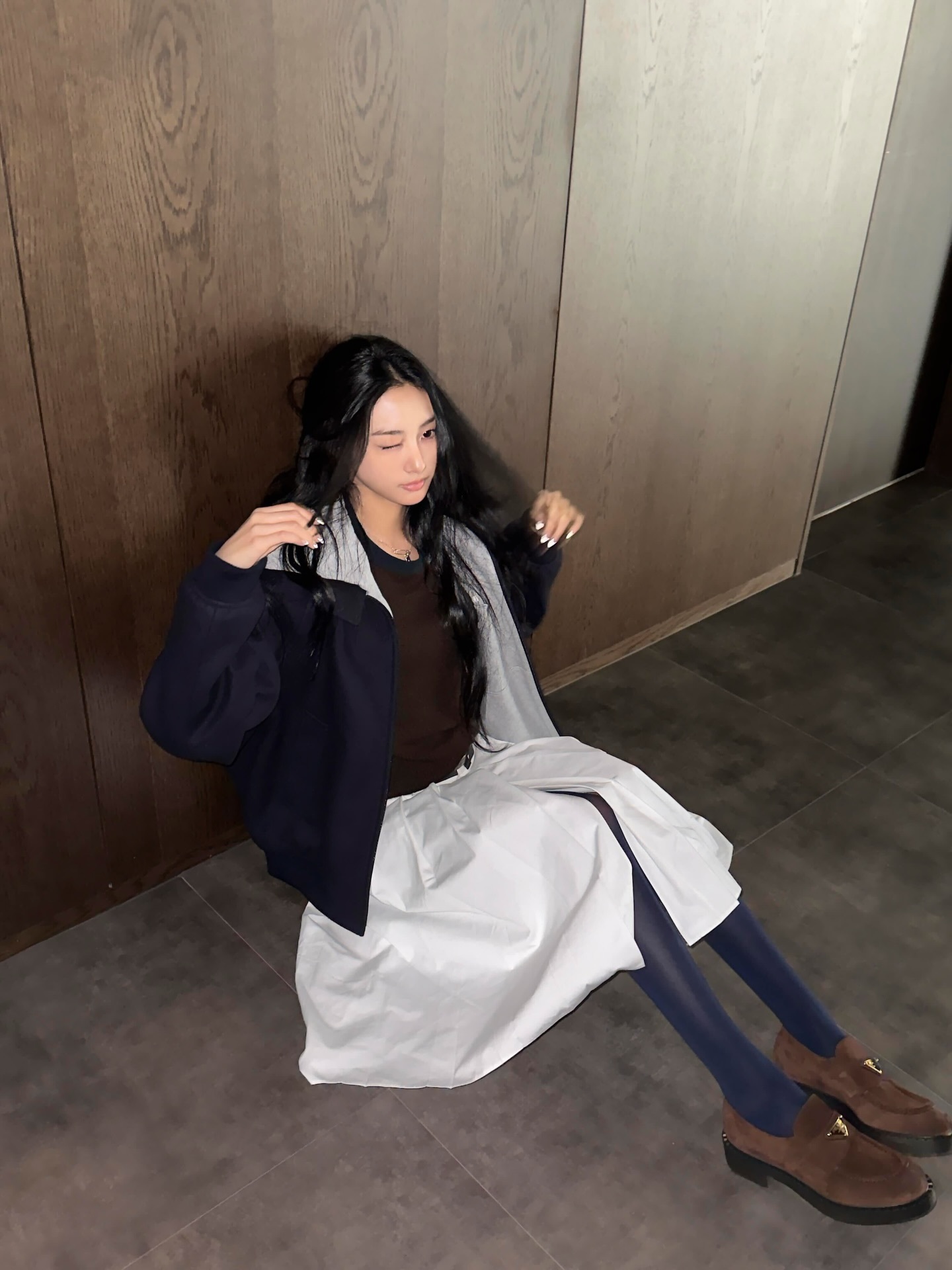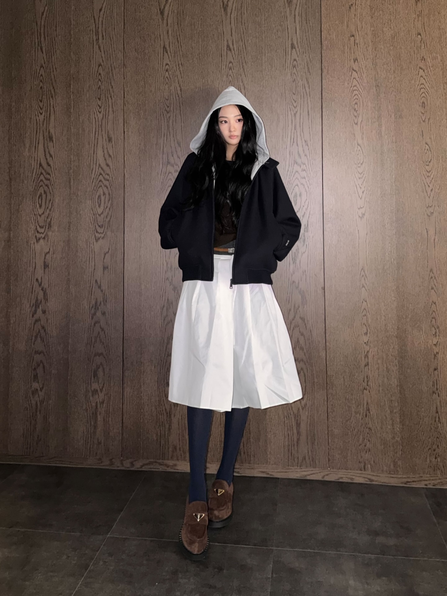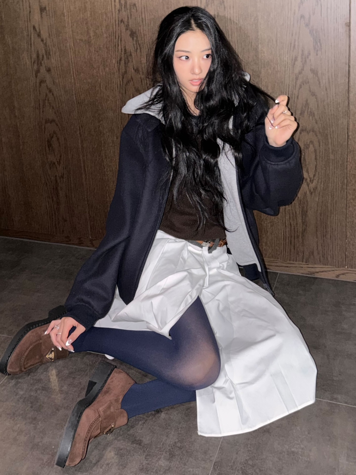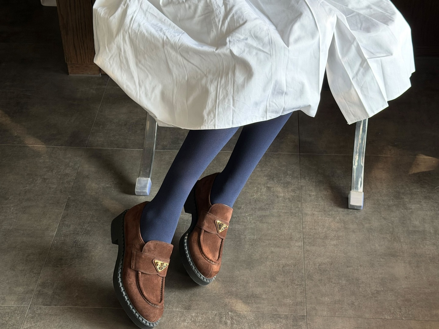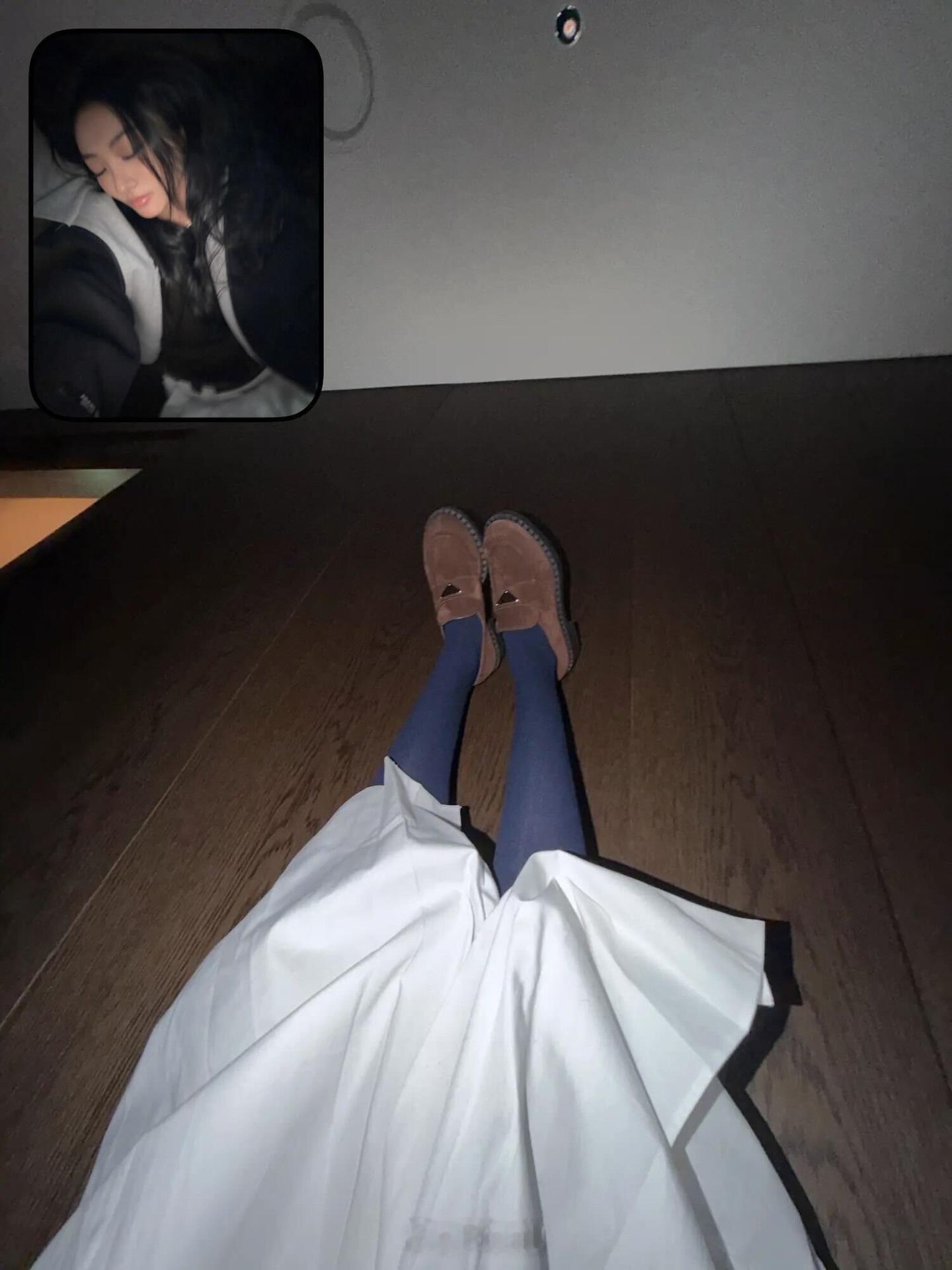 Gawon x Prada一组绒面皮革乐福鞋宣传图上线,深蓝、棕色、白色三色系穿搭。