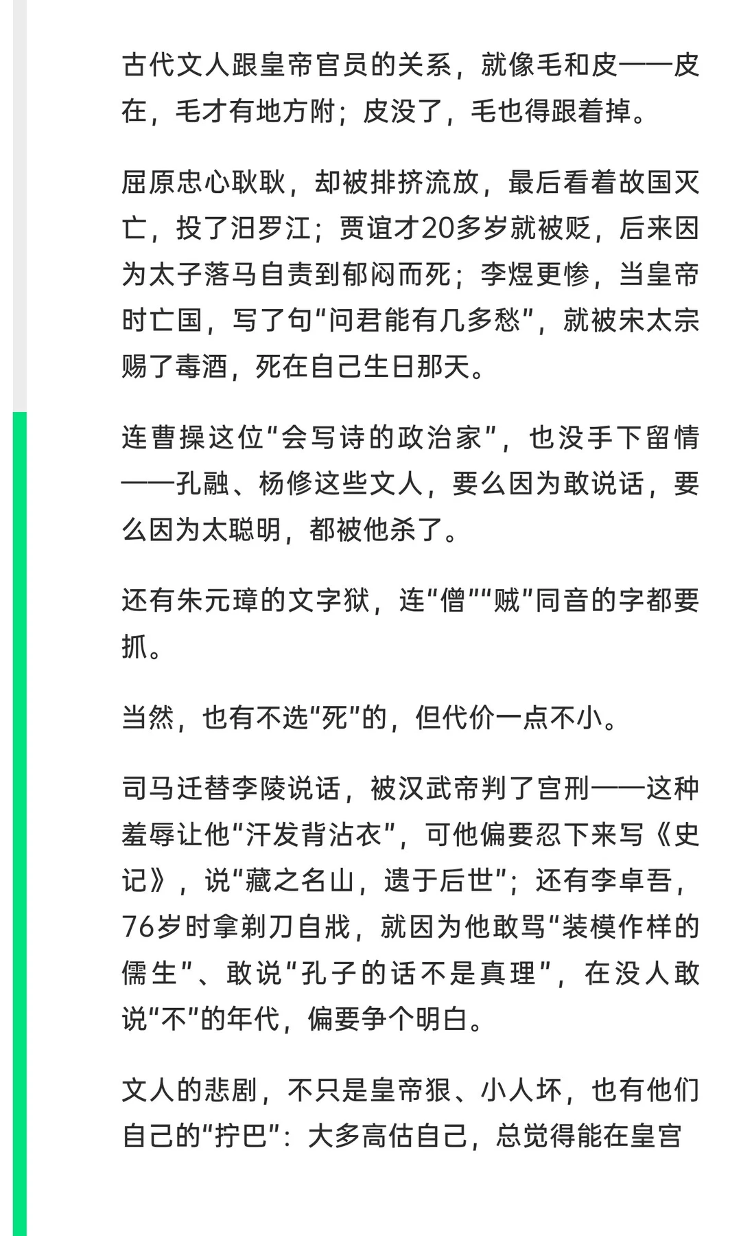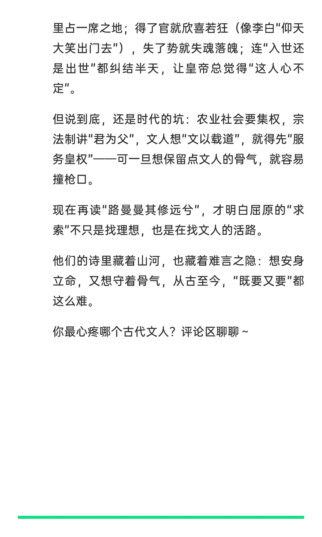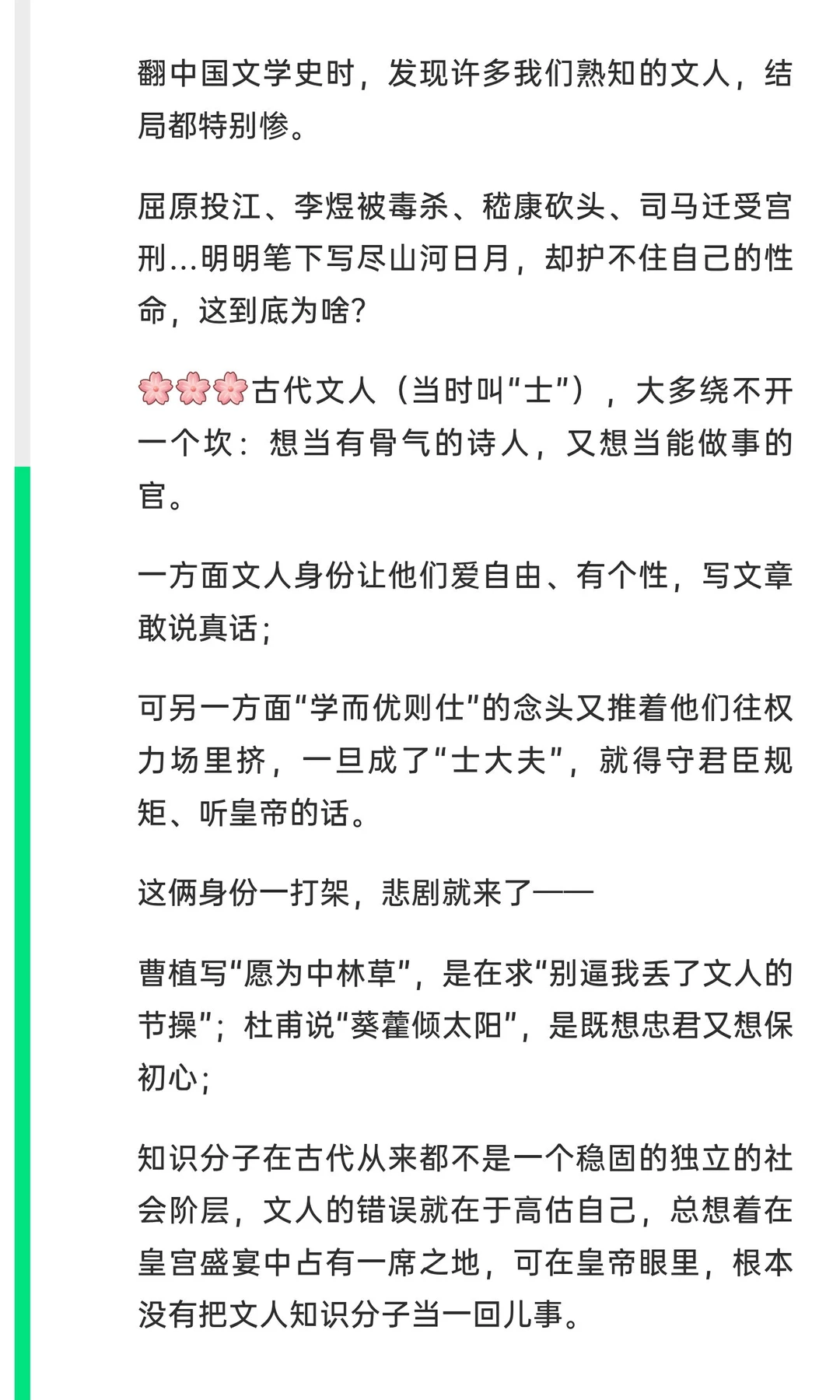 古代文人常陷入“既要又要”的困境:既想保持文人节操,又想入仕为官。他们高估自己,试图在权力场中立足,却常因身份冲突而悲剧收场。从屈原投江到李煜被毒,文人虽才华横溢,却难逃命运的捉弄。