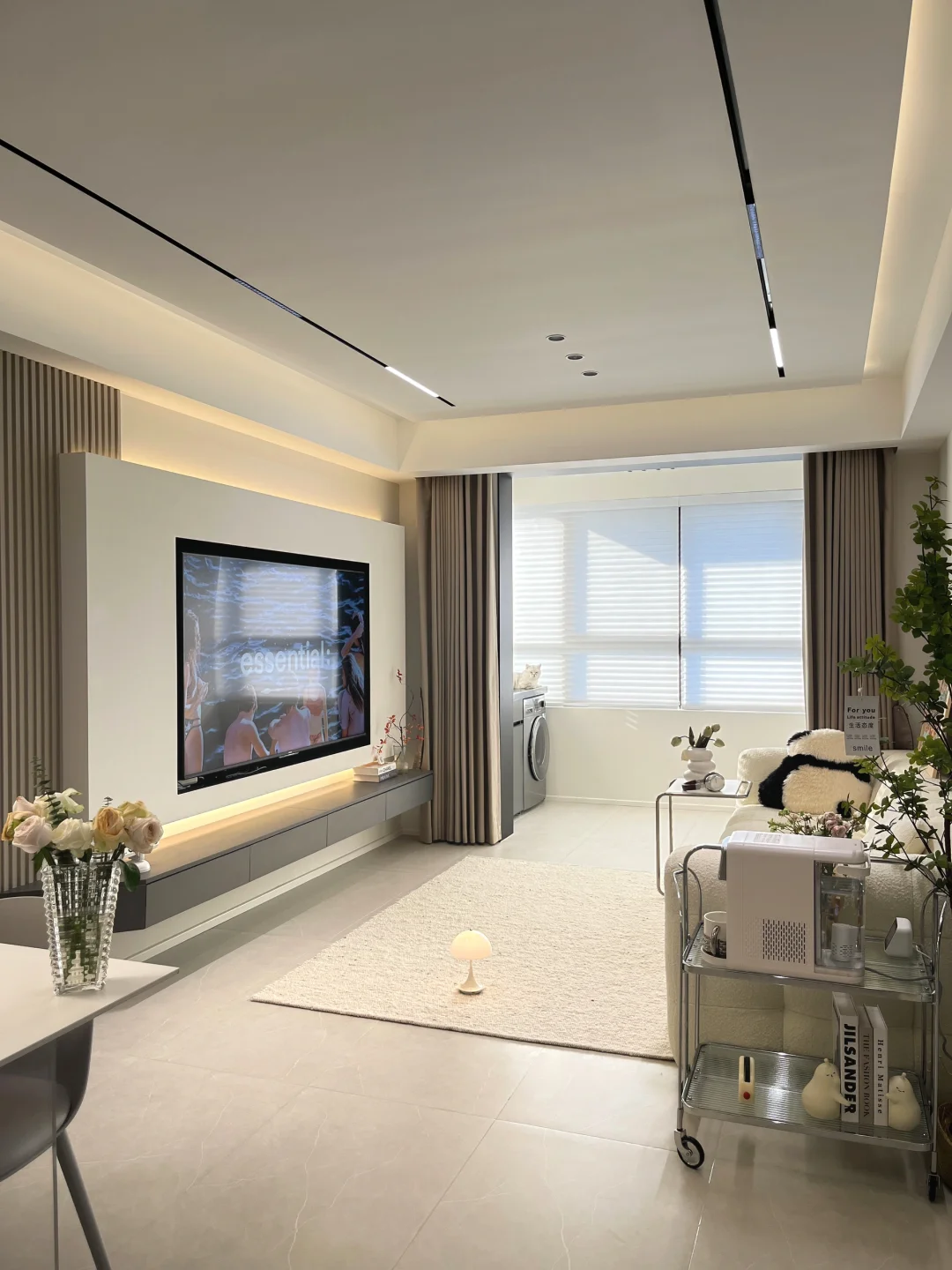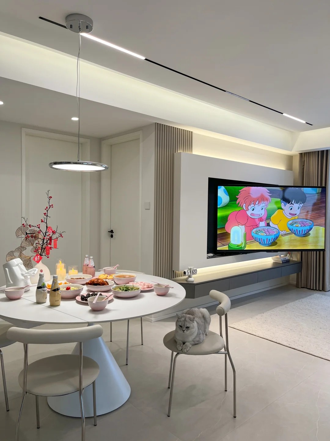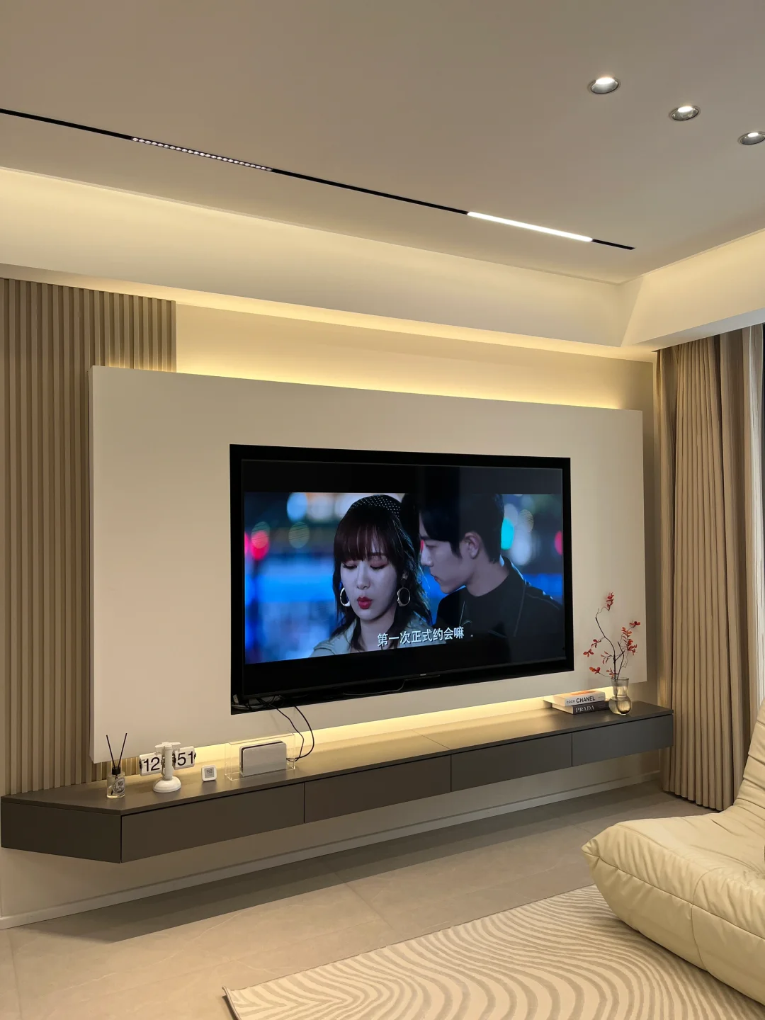 精装修改造 套内80平🏠 硬装花费4W 全部落地花费15W! 悬浮电视墙是石膏板做的 成本1500💰 内嵌75寸电视机📺 氛围感拉满[大笑R] 28岁有房有猫🐱 即将有娃!真的好幸福!~ 大家有任何问题 欢迎评论区留言[哇R]