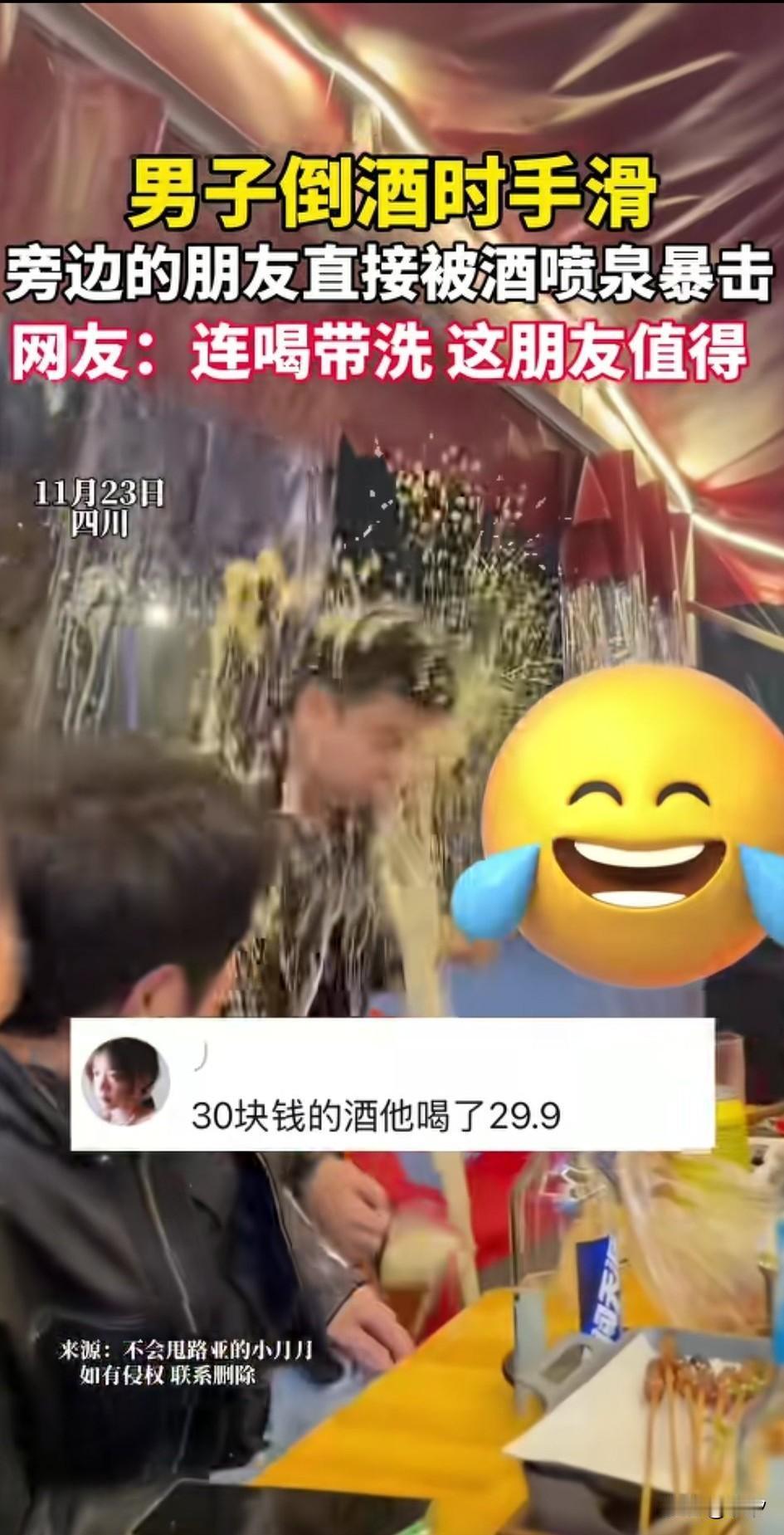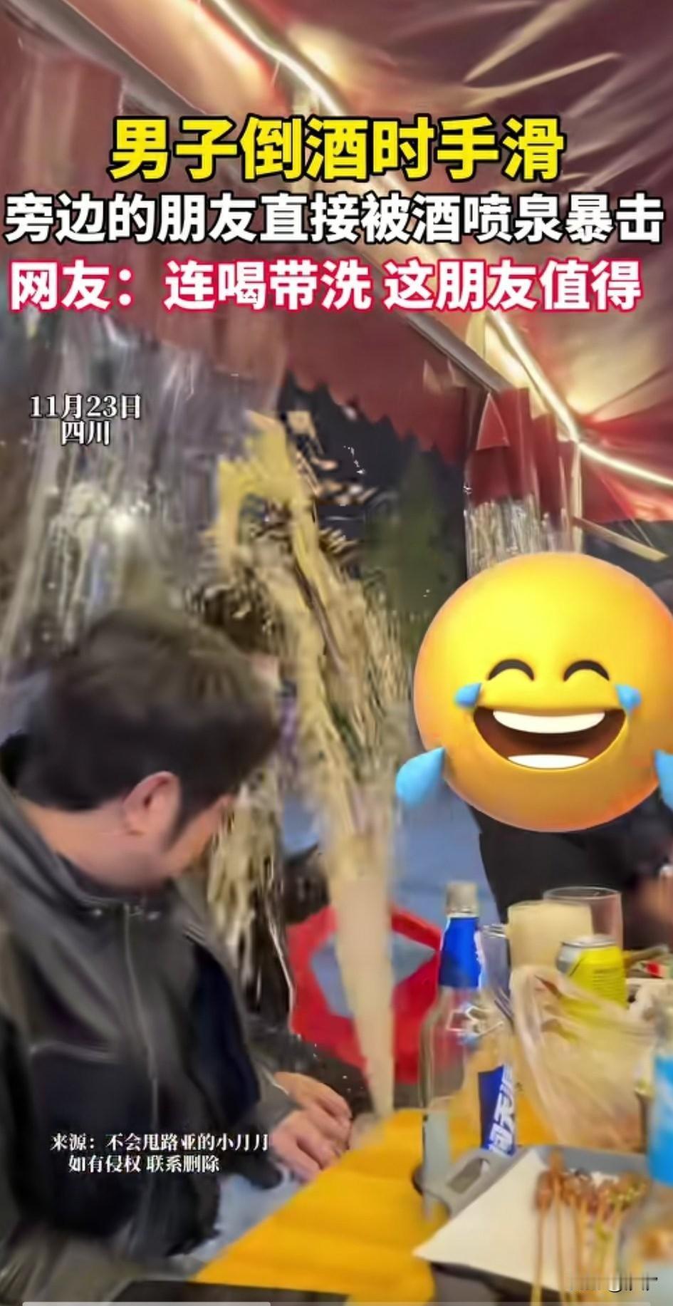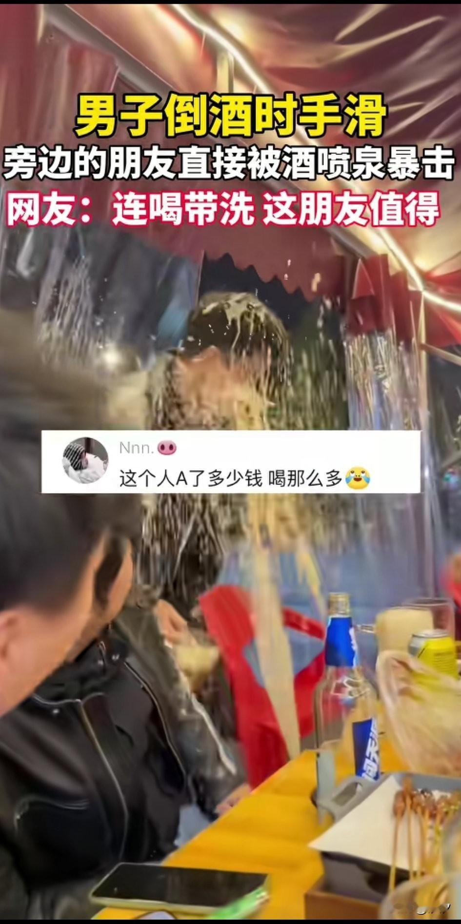男子和朋友一块聚餐, 他朋友拿起一大罐啤酒, 开心的给朋友们倒酒, 结果手不小心滑了, 啤酒掉地上后直接喷洒出来, 像喷泉一样, 直接喷了男子一脸, 男子这也是懵了, 随后迅速躲开, 这一幕可把他的朋友们都逗笑了, 一罐啤酒直接报废, 网友们表示这男子是A了多少钱? 还有网友表示30块钱的啤酒男子喝了29块9的! 聚会中的小插曲, 让朋友们都笑开了花儿, 这酒跟喷泉一样, 一看就是好酒, 大家觉得聚会上的插曲好玩吗? 和朋友聚餐你能接受AA制吗?老同学聚餐聚会你们还参加吗? 啤酒 啤酒误区