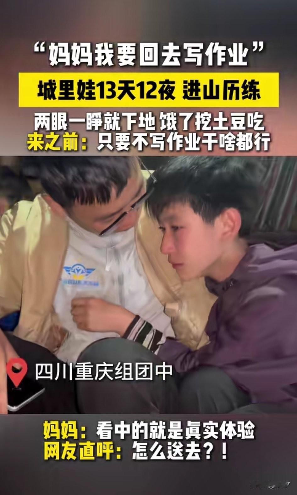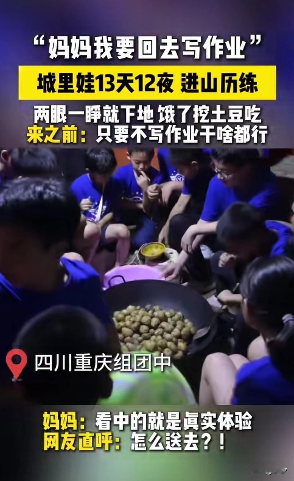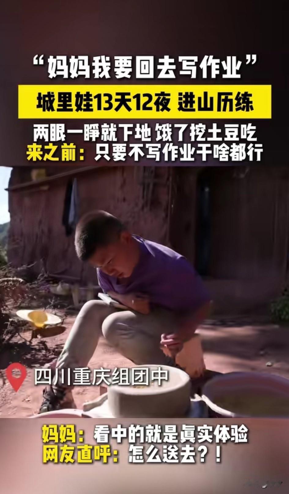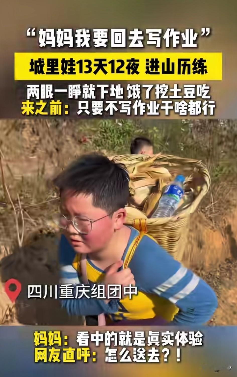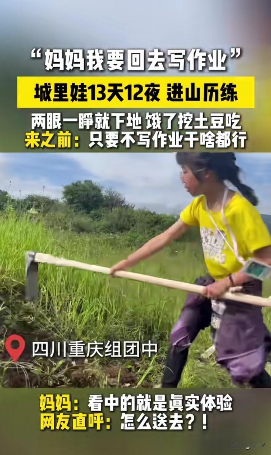 城里娃不愿意写作业, 妈妈就将他带进山里, 呆了13天12夜, 还有很多像他一样的城里小朋友, 都是不想好好写作业的孩子, 来之前都是只要不写作业,干啥都行! 以为是度假, 结果被家长带进了山里, 住在山里面两眼一睁就下地干活, 作业是不用写了, 还是得下地干活, 饿了就挖土豆吃, 四川重庆这组团进山让孩子历练, 真是一个好主意, 妈妈们都表示看中的就是真实体验, 城里小孩子不让吃点苦, 他们就不知道种地的辛苦, 不好好学习, 以后就只能受苦, 但换句话来说, 好好学习真的能有好未来吗? 大家觉得孩子们进山亲身体验生活的艰苦是好事儿吗? 儿子不写作业 儿童写作业 孩子不愿去学校 孩子不愿去上课 娃上不起学 农村孩子