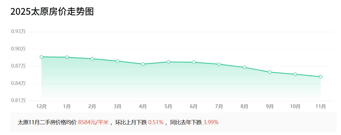 2025年11月,太原杏花岭区二手房均价7594元; 2024年11月,太原杏花岭区二手房均价7927元; 2025年11月,太原迎泽区二手房均价9581元; 2024年11月,太原迎泽区二手房均价10424元; 2025年11月,太原万柏林区二手房均价7933元; 2024年11月,太原万柏林区二手房均价7975元; 2025年11月,太原尖草坪区二手房均价6398元; 2024年11月,太原尖草坪区二手房均价6555元; 2025年11月,太原小店区二手房均价9117元; 2024年11月,太原小店区二手房均价9309元; 2025年11月,太原晋源区二手房均价9100元; 2024年11月,太原晋源区二手房均价9105元。 2025年11月份,太原六城区的房价总结一个字,那就是“跌”。 迎泽区作为太原的老牌核心区,拥有优质的教育、医疗资源,历来是房价的“压舱石”。但如今,这块石头也松动了。这意味着什么?意味着去年高位接盘100平房子的业主,今年账面上直接亏了8万多。一些房龄超过20年的“老破小+学区”,价格回调更剧烈,总价降15-20万的房源比比皆是。核心区的下跌,往往预示着市场信心的普遍不足。   杏花岭区每平米三百多的跌幅,对于总价七八十万的房子来说,感觉不明显,但却实实在在地增加了房东的出售难度。尖草坪区跌幅看似最小,但6000多的房价实打实还不如一些县城的房价高。   万柏林区是最尴尬的,有价无市,去年和今年的数据走势,几乎就是一条直线,小店区作为南城发展的引擎,聚集了大量改善型需求,但跌幅也接近2%,说明改善群体也开始犹豫,背后反应的是人们对未来收入预期的不确定性。   晋源区本月同比去年,稍有5元的波动。主要因为晋源区是新区,整体房源品质较高,大多为次新房、改善盘,抗跌性相对比较强。   有一位杏花岭区的中介说,现在的成交周期普遍从过去的1-2个月拉长到4-6个月。如果房东急用钱,比如孩子结婚、生意周转,挂牌价必须比同小区均价再低8%-10%,才能吸引到为数不多的诚意买家。哪怕是以往比较坚挺的学区房,现在也出现了松动。   市场的降温,对于卖家是煎熬,对于买家却是机会。这一轮调整,本质上是在挤掉前些年过热时产生的泡沫,让房子回归真实的居住价值。对于我们每一个普通人而言,看懂趋势,放平心态,不恐慌,不贪婪,才能在市场的起伏中做出最明智的决策。
