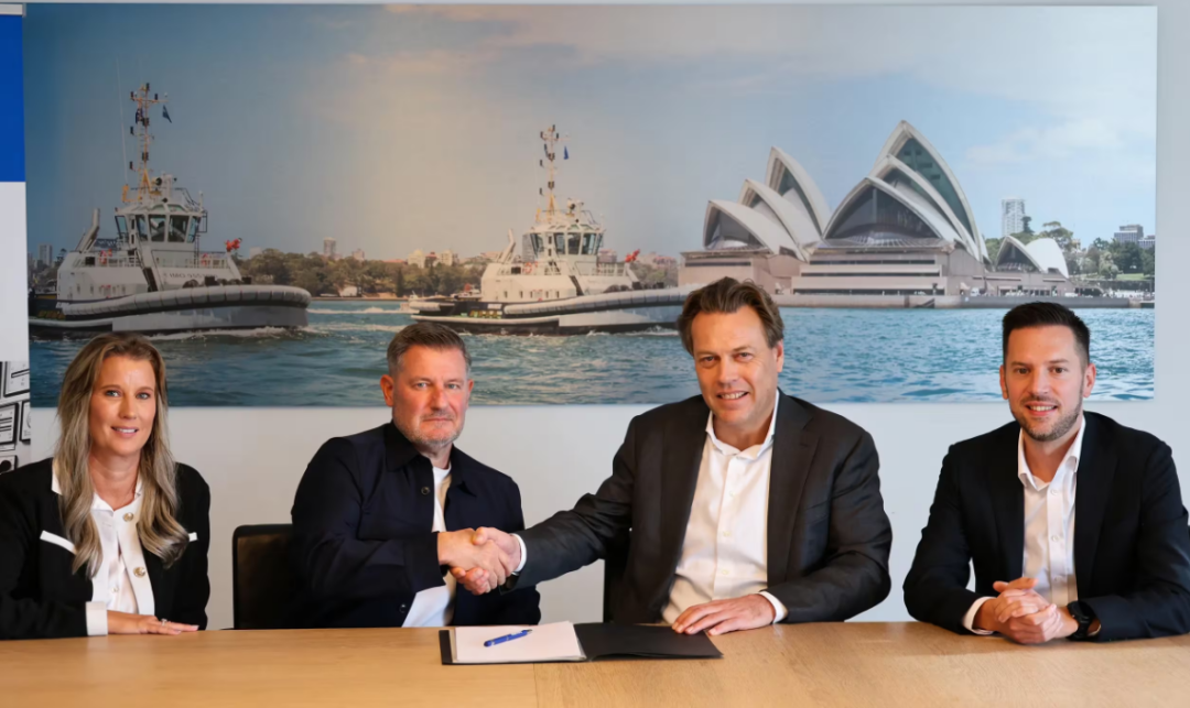 至右:I.M.E集团联合董事TinaLangford、I.M.E集团董事总经理PaulLangford、达门造船集团首席执行官ArnoutDamen、达门服务英国区董事EdwinvanderPoel
