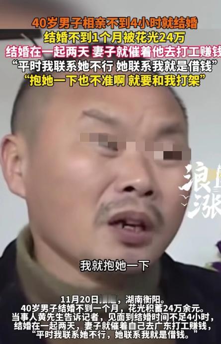 短剧都不敢这么演!湖南衡阳,40岁男子相亲时遇到心仪的女子,两人相识不到4小时就领证结婚。本以为找到了爱情的幸福,不成想,结婚刚两天,妻子就催着他去广州打工赚钱,平时也不允许他主动联系她,妻子每次打电话开口就是要钱。结婚不到一个月,男子花光了24万积蓄,还没抱过妻子一下。男子委屈哭诉:每次想要抱一下她,她很抗拒,还要和我打架。 湖南衡阳,40岁的黄某最近向记者倾诉心里的痛苦和无奈。 他是一名普通打工的工人,多年来一直单身。在家人的催促和亲友的关心下,他开始尝试相亲。 黄某回忆道:“我也不是不想结婚,只是之前一直没遇到合适的人。”直到不久前,他通过相亲认识了梁某,一位外地来的女性。 据黄某回忆,当天两人在相亲场合仅仅相识不到四个小时,他就感觉与梁某非常投缘,几乎是“一见如故”。 两人交谈甚欢,笑声不断,黄某甚至觉得自己找到了生命中的另一半。兴奋和冲动之下,当天下午,他们便去了民政局登记结婚。 黄某说:“当时脑子里都是甜蜜的幻想,觉得终于不再孤单了。” 结婚仅两天,梁某就提出让黄某去广州打工赚钱的要求。黄某原本以为只是小小的工作安排,但梁某却态度坚决,几乎不容拒绝。 更让黄某感到不安的是,婚后几乎不能主动联系妻子。每次电话一接通,梁某开口的第一句话几乎都是:“你什么时候把钱给我?” 或者“你打的钱够了吗?”黄某觉得自己每天都像在面对一台冷冰冰的提款机,而不是自己的妻子。 随着时间推移,这种状况愈发严重。结婚不到一个月,黄某的积蓄——24万元——几乎全部花光。 对于一名普通上班族来说,这笔钱是多年的辛苦积蓄,是生活的保障,也是未来计划的基石。如今,他不仅失去了经济安全感,还没有得到一丝家庭温暖。 黄某哽咽地告诉记者:“我结婚了,可连抱她一次都没抱过。” 他回忆,每次尝试靠近妻子,甚至想要一个拥抱或简单的亲密接触,梁某都会强烈抗拒,有时甚至爆发争吵或肢体冲突。黄某无奈地说:“我只想抱她一下,她却总是推开我,还要和我打架。” 黄某坦言,他开始怀疑自己是否陷入了“婚姻骗局”。他回忆,梁某在结婚后的每一次通话几乎都是催钱,金额从几千元到几万元不等,几乎没有间歇。 他尝试解释自己的经济状况,希望梁某能理解,但每次解释都被忽视,甚至换来冷漠或指责。黄某说:“我真的怀疑自己被骗了,我以为找到了爱人,结果发现自己像是成了提款机。” 在黄某家中,记者看到他的生活环境整洁但显得冷清。黄某坐在沙发上,双手抱膝,眼神中透着无奈和疲惫。 他说:“每天心里都很难受,朋友劝我冷静,可冷静下来更觉得心里空落落的。”他拿出手机,里面几乎全是来自梁某的催款信息,每条信息都让他心里紧张,像是随时可能爆发的压力源。 黄某的父母曾劝他慎重对待婚姻,但黄某说:“我太相信她了,没想到会变成这个样子。” 他坦言,婚前两人几乎没有深入了解彼此的家庭背景和生活习惯,仅凭短短几个小时的好感就仓促结婚,这或许也是导致如今困境的重要原因。 心理学专家分析,黄某的情况在现实生活中并不罕见。近年来,短时间结婚和“速婚”现象增多,一些人因为冲动或对爱情的过度理想化而忽略对方的真实情况。 专家提醒,婚姻不仅是感情的结合,还涉及经济、责任和日常生活。遇到类似情况时,应保持理性,必要时寻求法律或心理援助。 黄某曾尝试与梁某沟通,但每次交流都以争吵收场。他无奈地说:“我只是希望她能理解我,也希望她能给我们一点正常夫妻的温暖,可她总是只想着钱。” 这种心理落差让他每天都处于焦虑和压抑状态,甚至影响了睡眠和工作。 黄某的故事在社交媒体上引起了广泛关注。网友们对他的遭遇表示同情,同时提醒他保护自己的财产和心理健康。 律师也建议,如果黄某怀疑被骗,应保留相关证据,依法维护自己的权益,包括婚姻无效或财产返还的途径。 黄某表示,他仍希望婚姻有转机,
