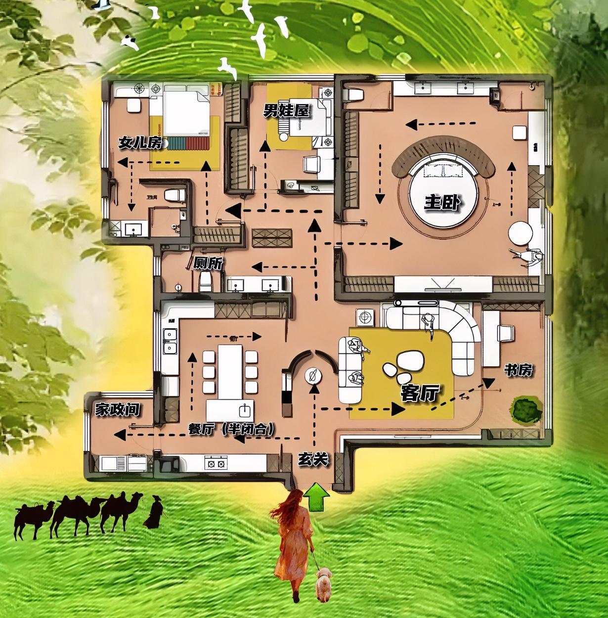 我观这户型骨骼惊奇,很适合大美女,凭二米梦幻大圆床,稳坐大平层第一的节奏! 185㎡凭圆床多情,玄关多奇,沙发雍容,餐厅多秀丽 ,厕所多变,打造出审美高端,布局吸引人,动线有节奏感! 其实就是两洄游,大洄游出颜值,小洄游定韵味! 一开一合,像破茧的房子,终于找到翅膀的布局韵律! 特别理解,浪漫人为啥这么喜欢大贸圆床,打掉一个固定主卫,换来开放式的主卫,让我也闷逼的格局,女主却喜欢不得了! 另一个洄游在餐厅,算得上封闭厨房,一体化的餐厨,就是一条洄游动线下,大食堂! 传递了一种修己身的用餐哲学,如此动线,软沙发都不怕油烟! 简易的动线如跳舞,打造独一无二的布局,如酒香酿成的韵味,从尘埃里开出花!