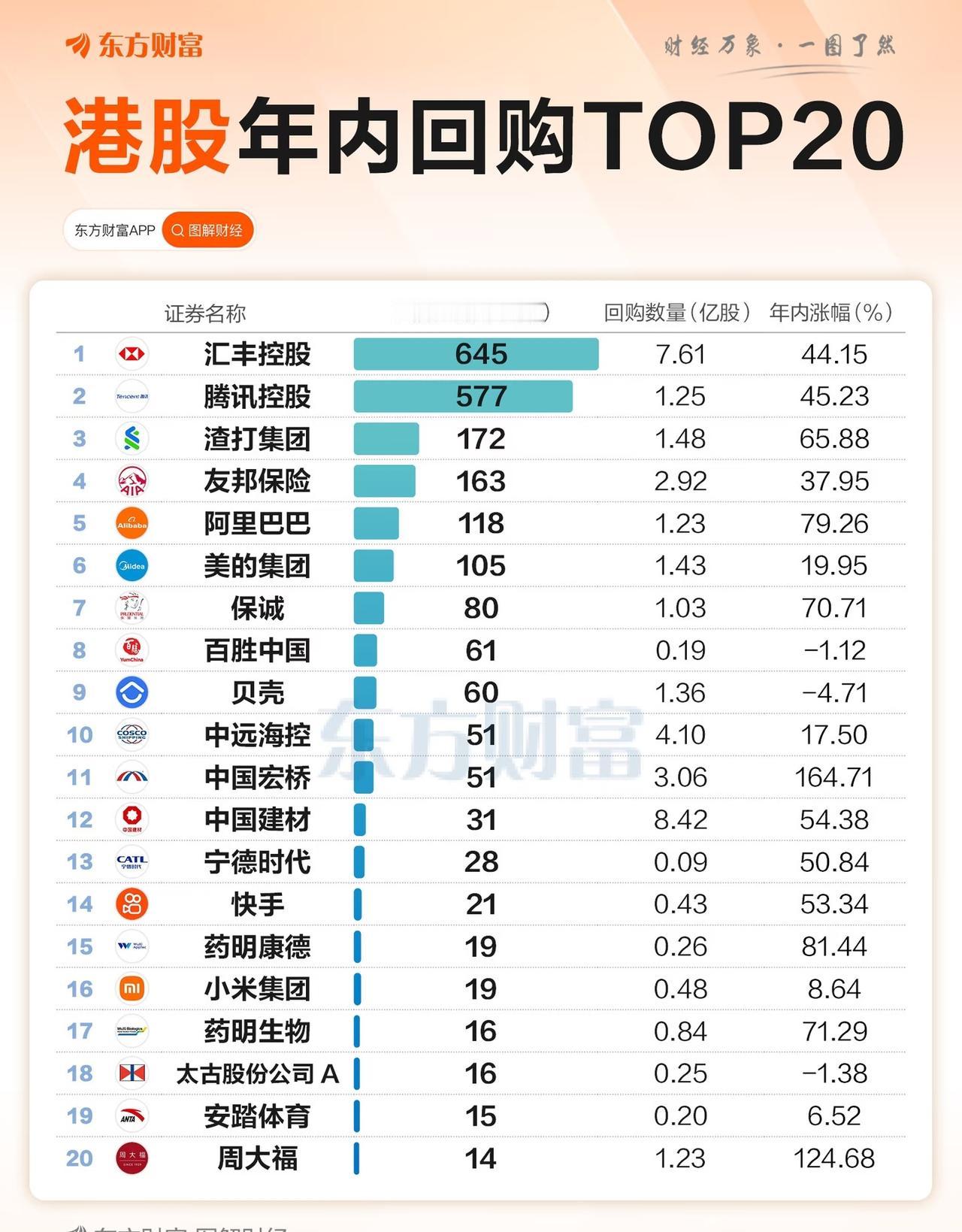 A股与港股年内回购TOP20股票。 图一为A股年内回购TOP20,背景为米白至浅橙渐变,标题醒目,数据分三列呈现:证券名称(含公司Logo)、回购金额(亿元)、回购数量(亿股)及年内涨幅(%)。美的集团以96亿元居首,回购1.32亿股,年内涨10.44%;其余上榜公司包括贵州茅台(60亿、-1.88%)、宁德时代(44亿、43.08%)、徐工机械(31亿、30.24%)等,回购金额从96亿元递减至8亿元,涵盖家电、白酒、新能源、机械、医药等多行业,直观展现A股高回购公司的资金规模与股价表现。 图二为港股年内回购TOP20,同样采用浅橙背景,核心数据为证券名称、回购金额(亿元)及年内涨幅(%)。汇丰控股以645亿元登顶,年内涨44.15%;腾讯控股(577亿、45.23%)、渣打集团(172亿、65.88%)紧随其后;榜单还包含阿里巴巴(118亿、79.26%)、美的集团(105亿、19.95%)、周大福(14亿、1234%)等知名企业,部分公司如百胜中国(-1.12%)、贝壳(-4.71%)年内下跌,而中国宏桥(164.71%)、药明康德(81.44%)等涨幅显著,凸显港股高回购公司的市场分化特征。 两张图清晰梳理了年内A股、港股回购金额前20公司的关键数据,便于快速把握市场回购动态与公司表现。